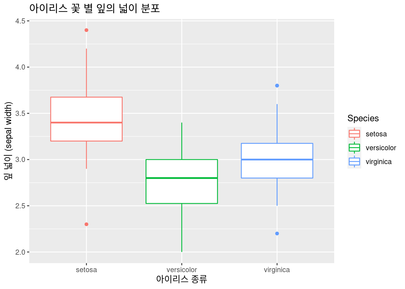 ggtitle("아이리스 꽃 별 잎의 길이 분포") +