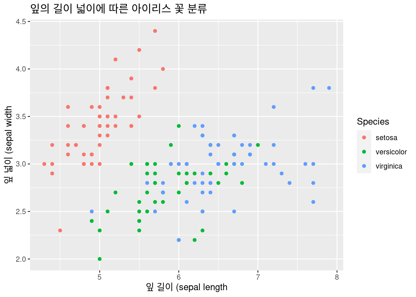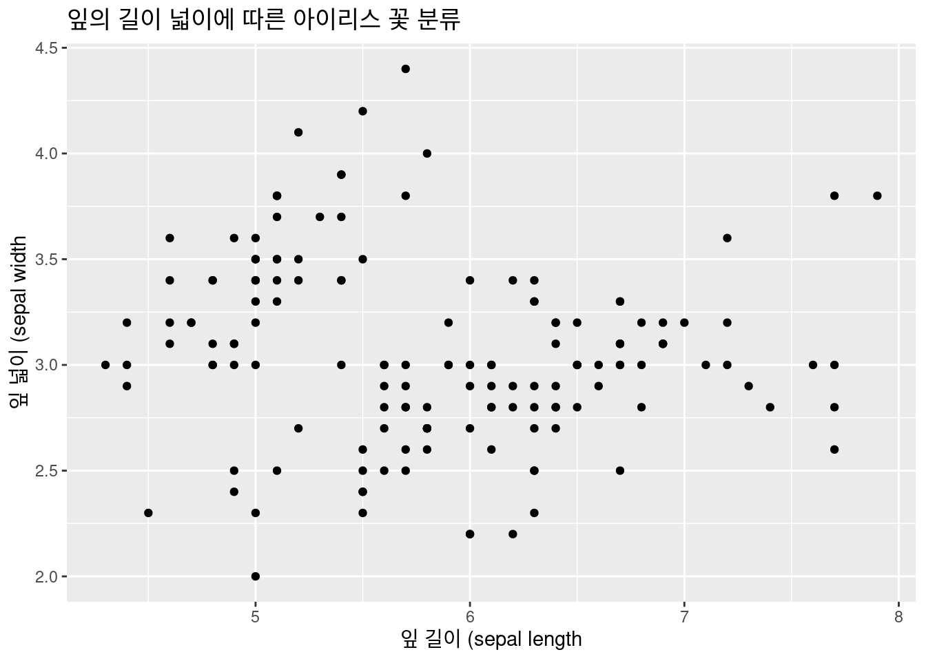 xlab("잎 길이 (sepal length") + ylab("잎 넓이 (sepal width") +