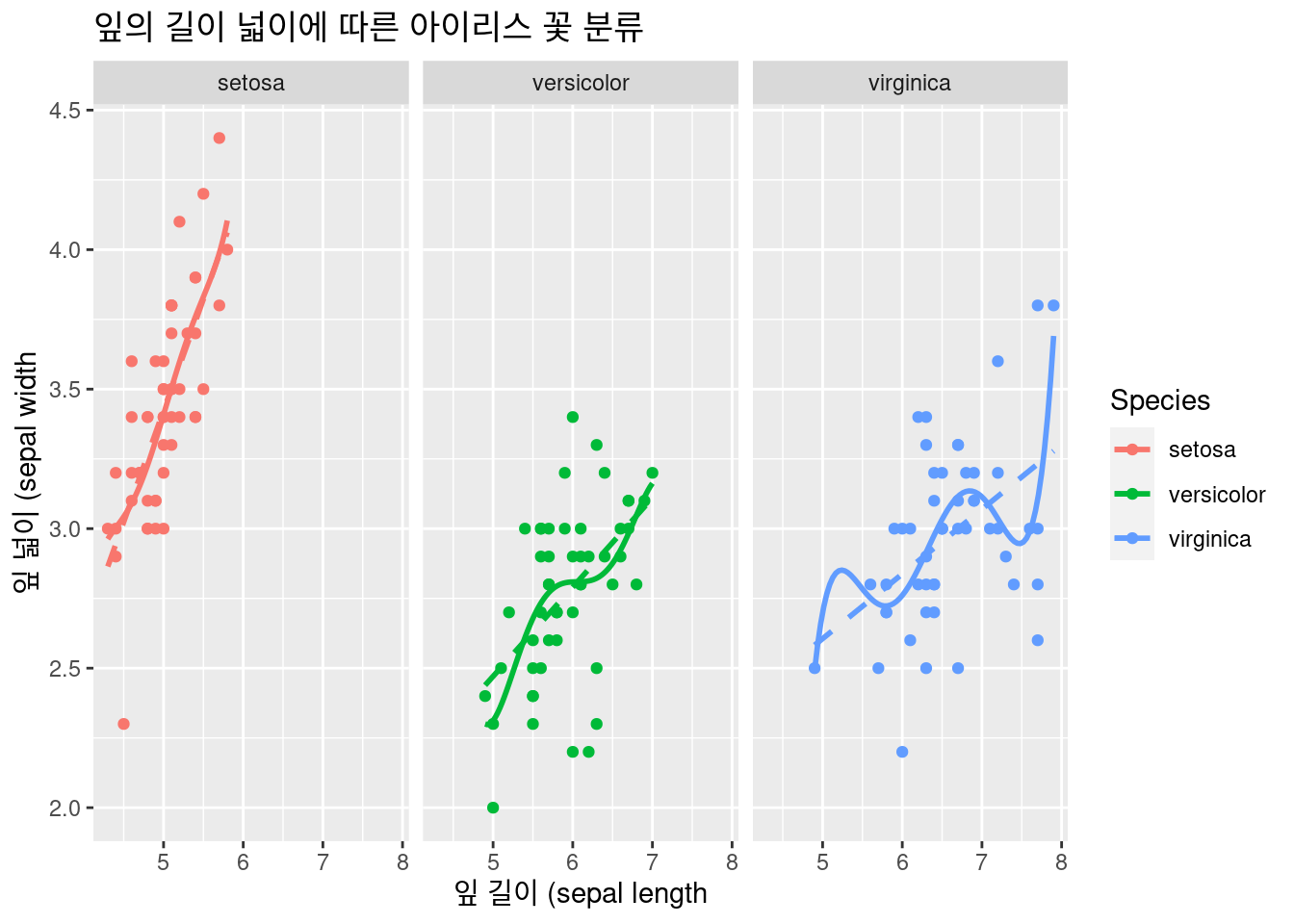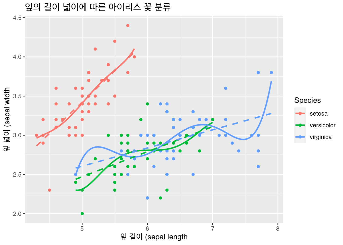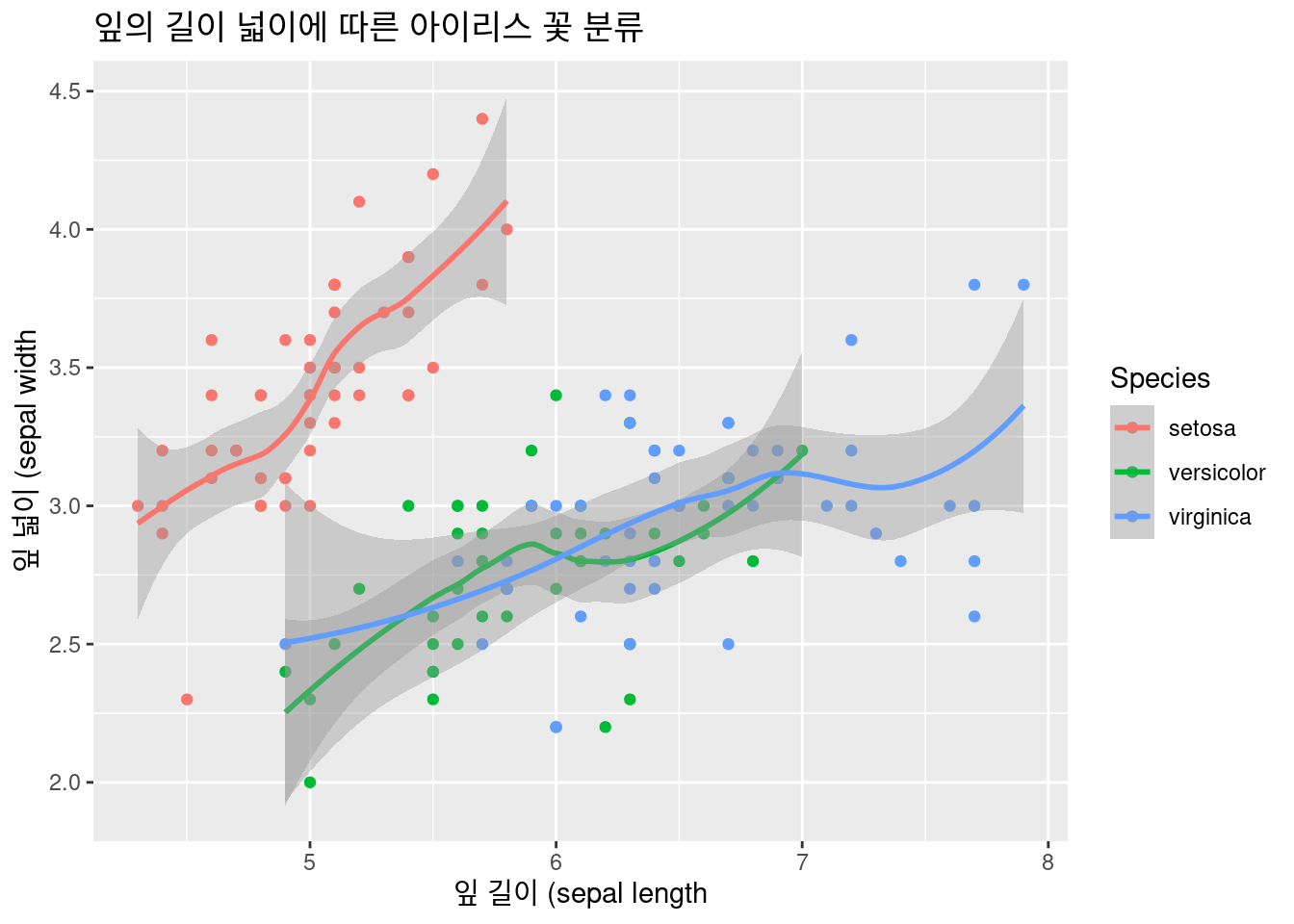 어떻나요? 조금더 좋아졌습니다. 이번에는 추세선 geom_smooth() 를 추가하여 종류별로 잎의 길이와 넓이와의관계를 보겠습니다. geom_line() 도 추가해 보세요. 여기서는 논리적으로 효용성이 없어 생략하겠습니다 .