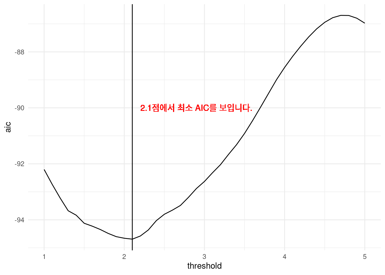 label = paste0(round(opt.thres, 3), '점에서 최소 AIC를 보입니다.' )) +