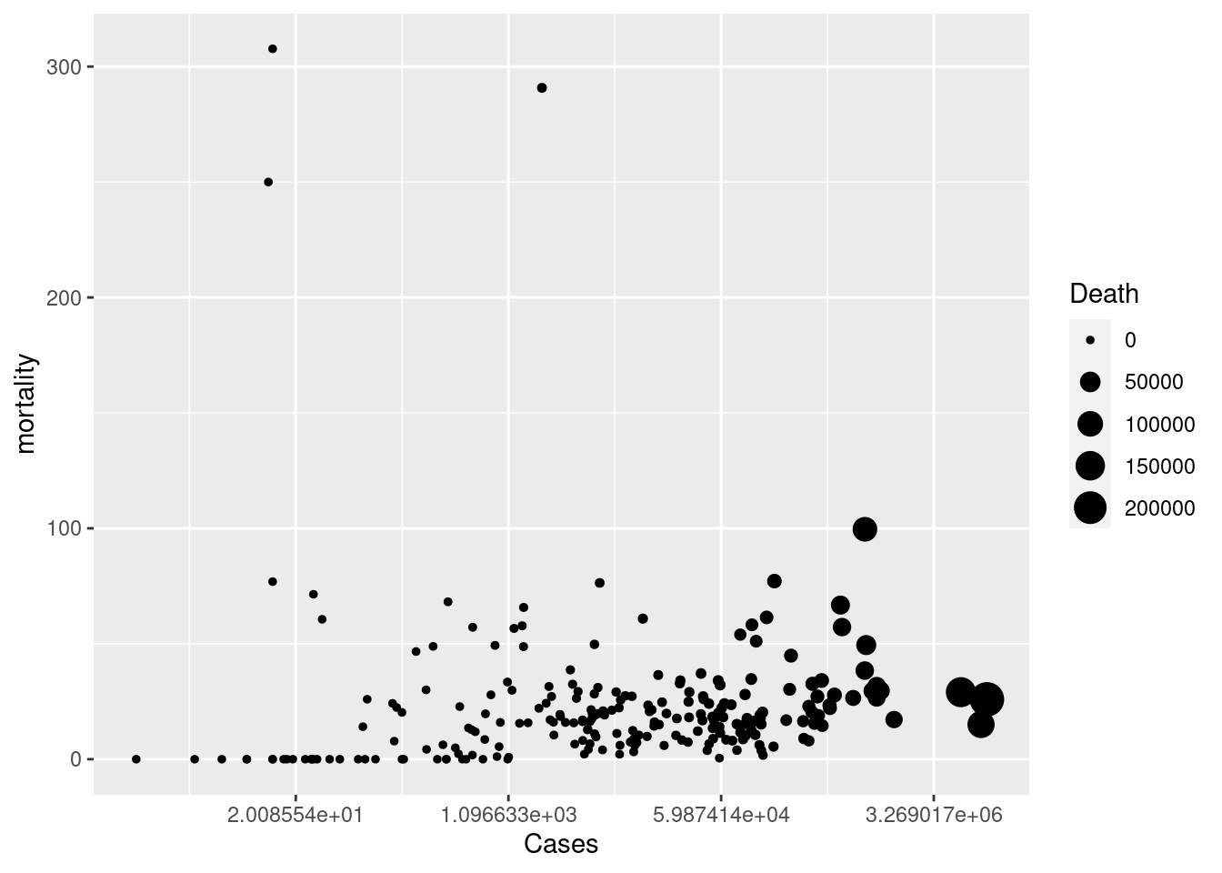 ggplot(aes(x = Cases, y = mortality, size = Death))+