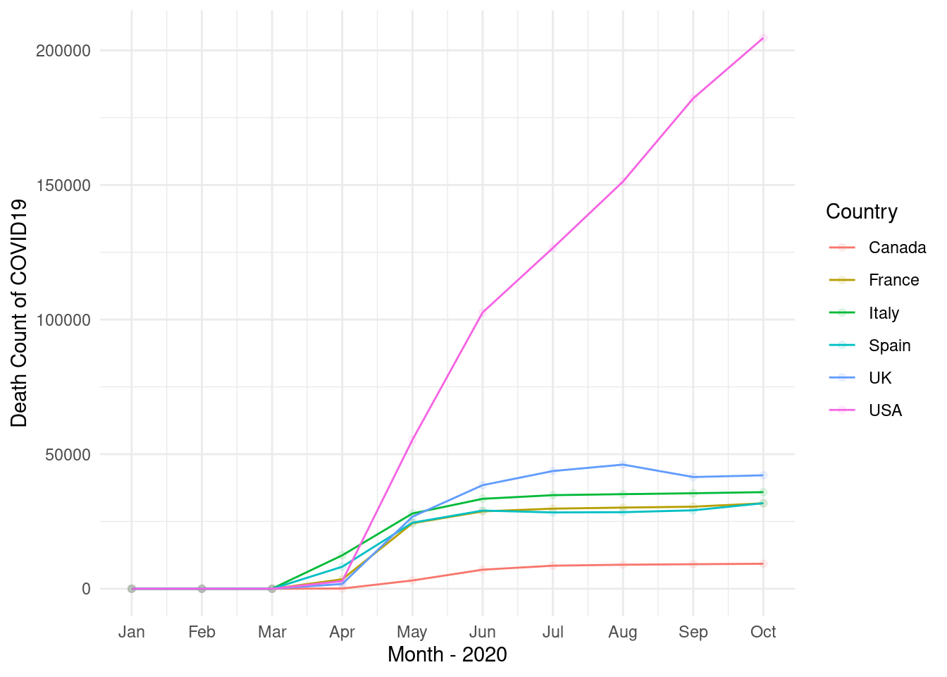 select countris of “UK, Italy, France, Spain, USA, Canada” and plot the trends. and upload the final plot in google class