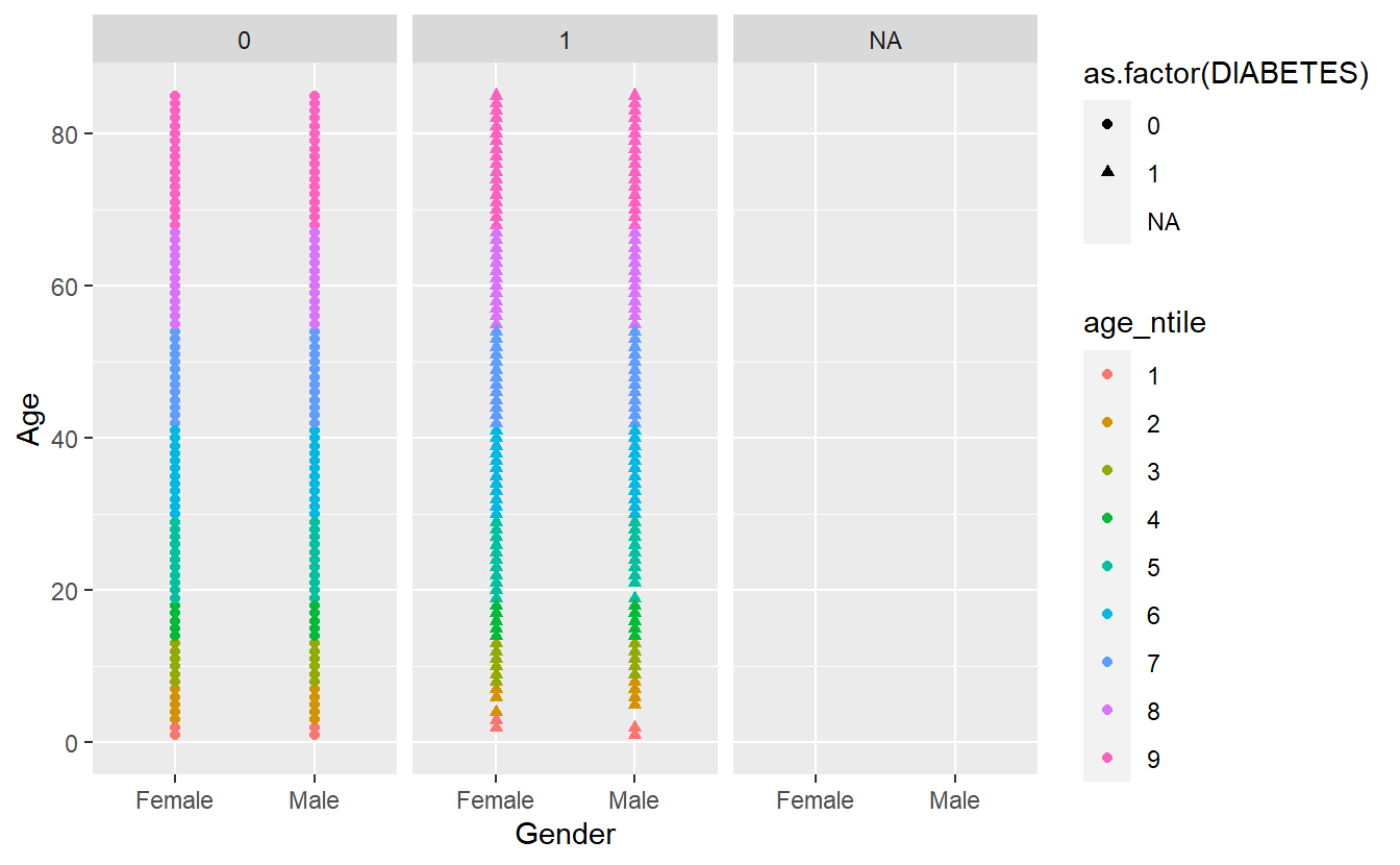 ggplot(aes(x = Gender, y = Age, color = as.factor(DIABETES), shape = age_ntile)) +