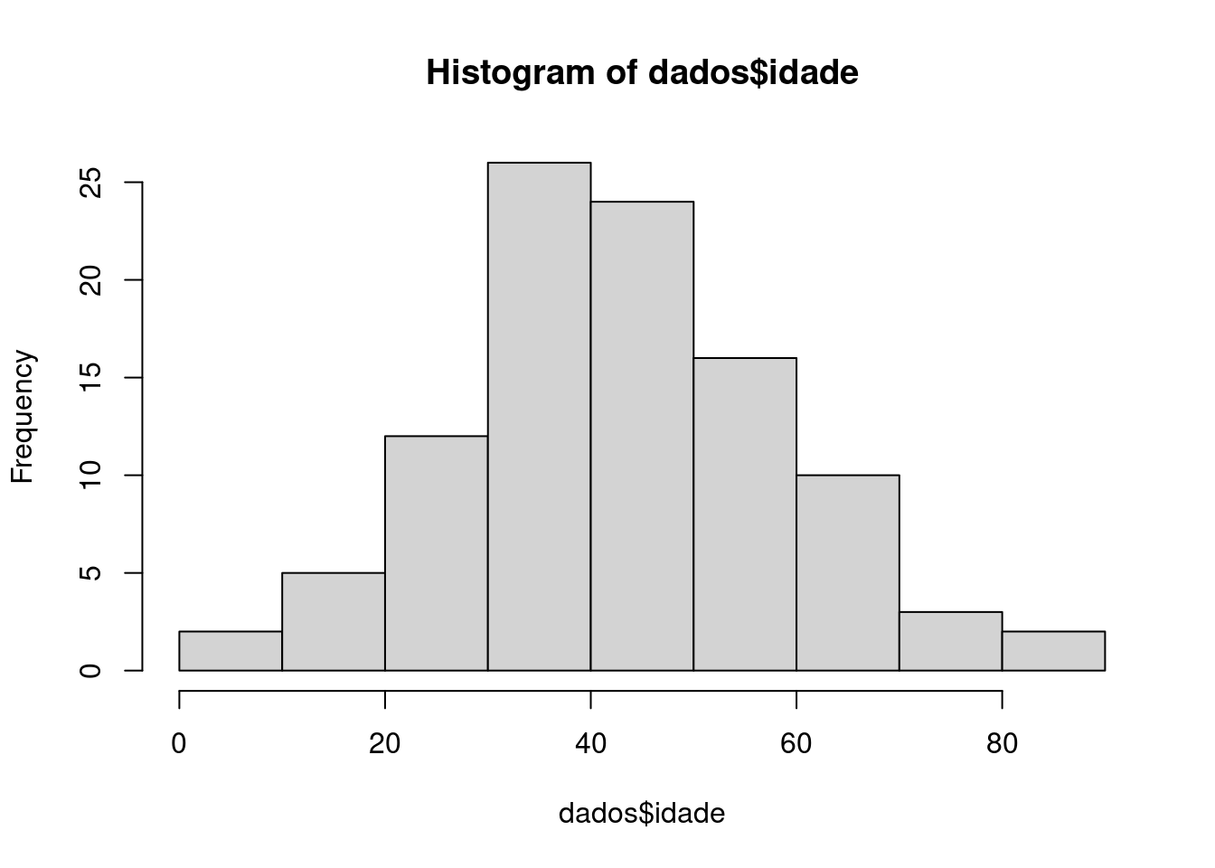 hist(dados$idade, main = "Distribuição de Idade", xlab = "Idade", ylab = "Frequência", col = "deepskyblue", border = "black")