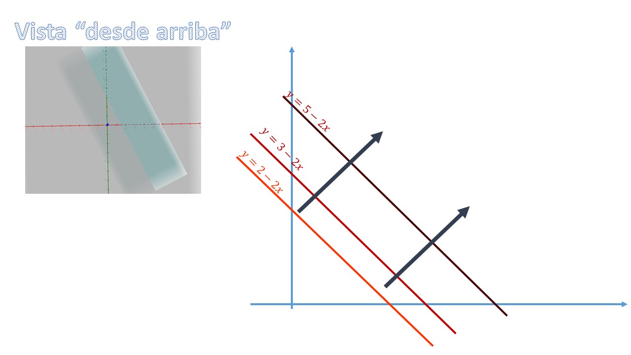 As you already know about Maths I, we are working with functions in two variables. Remember that \(f:\:\mathbb{R}^{2}\rightarrow\mathbb{R}\) is a function whose domain is contained in the set of two-dimensional reals (\(\mathbb{R}^{2})\) and the image are the real ones (\(\mathbb{R})\), from such a way that its graph is three-dimensional. For example, the \[ f(x,y)=2x+y-3, \]