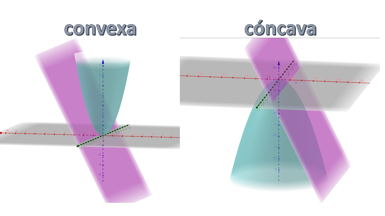 In the case of two variables, we will say that a function \(f:\:\mathbb{R}^{2}\rightarrow\mathbb{R}\) is convex if approximated by tangent planes in the environment of a point \((x^{*},y^{*})\), these planes always approximate by default (that is, they are below). On the contrary, it will happen when we want define a concave function: see FIG3: