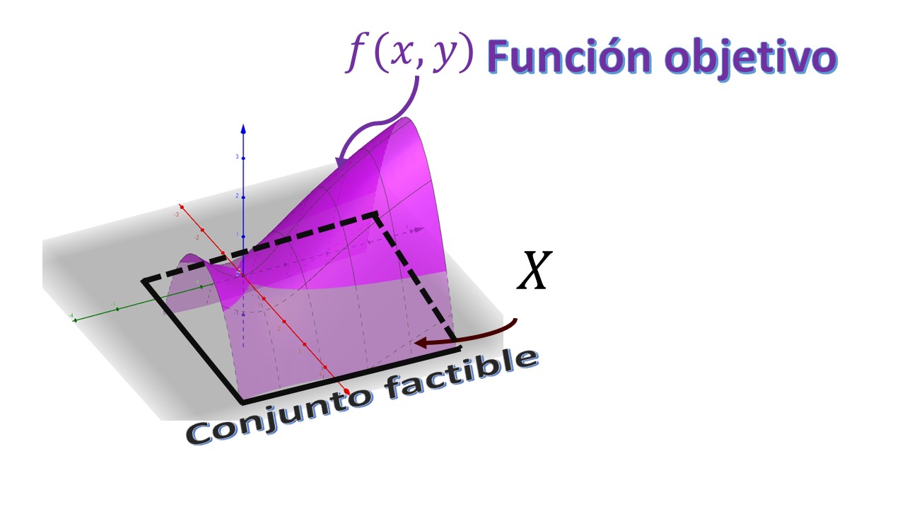 Where \(f(x,y)\) is the objective function (which we want to optimize) and \(X\) is known as the feasible set: that is, it is the place where we look for the values of \((x,y)\) to be able to solve our optimization problem. In this course, we will assume that \(X\subseteq\mathbb{R}^{2}\), that is, the feasible options will be pairs of real numbers in two dimensions and that, in addition, these will be a subconjutno of said space. In FIG 1, we show the 3D graphic of an objective function represented on a set of feasible solutions \(X\) formed by a square.