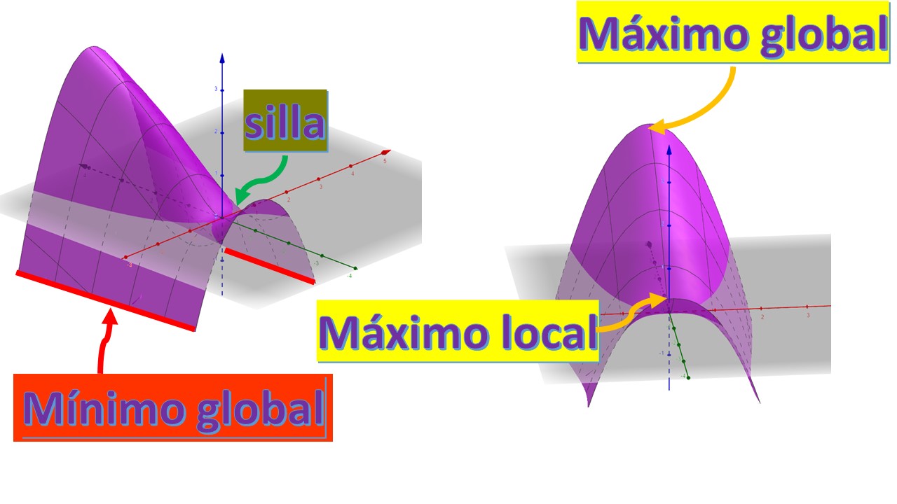 Remember that our goal will be to look for global optimums: that is, the best/worst of all candidates for highs and lows of the objective function. In FIG2, we represent the overall maximum and minimum of the function \(f(x,y)=\ln(1+x^{2}+y^{2})-x^{2}\), for the values \((x,y)\in X\), as well as the local maximums and minimums. Remember that general methods of searching for optimums usually find local critical points that, later, we will have to analyze to know which of them are global.