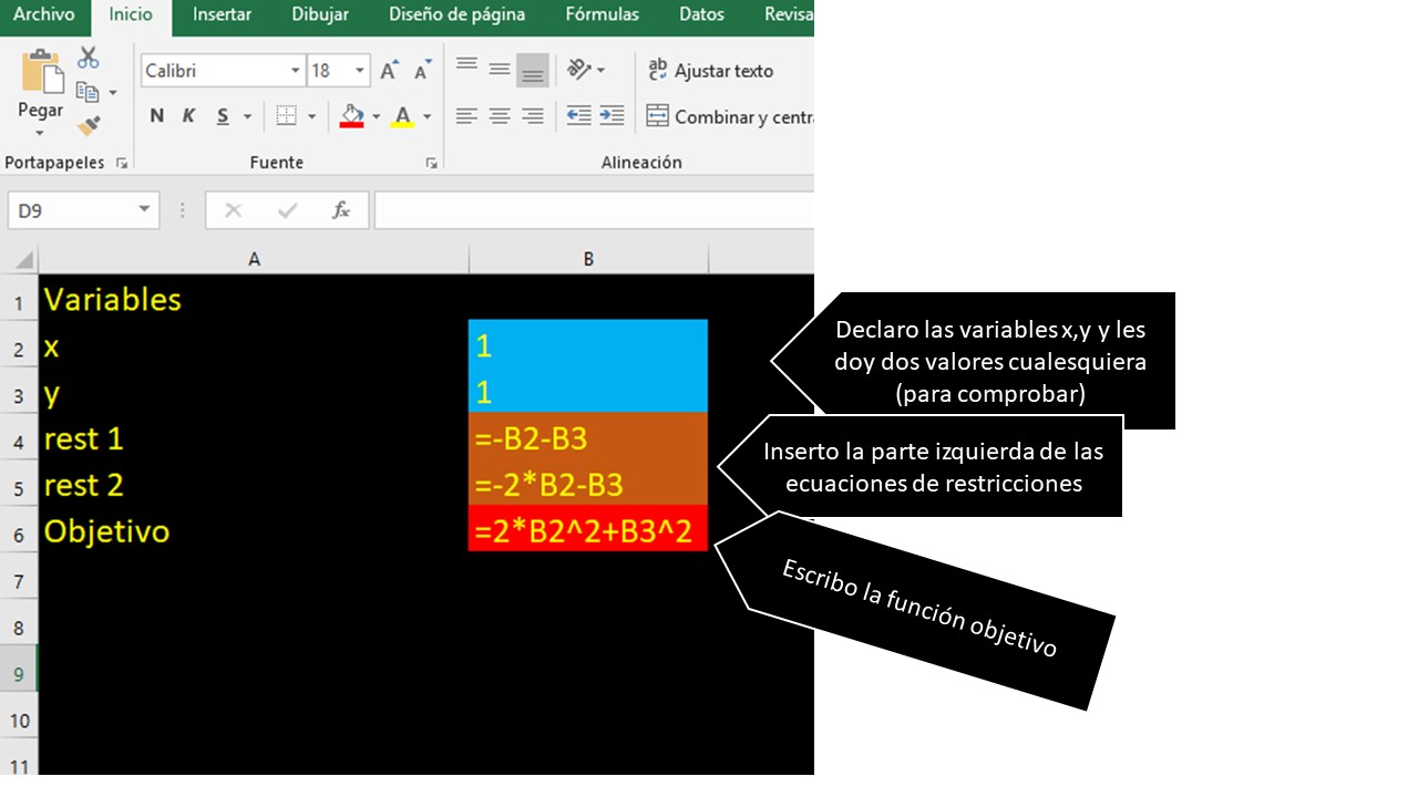 Now let’s work with class 2 problem using Excel. Start by declaring who your variables are, the target function and, of course, restrictions. Do it like this: