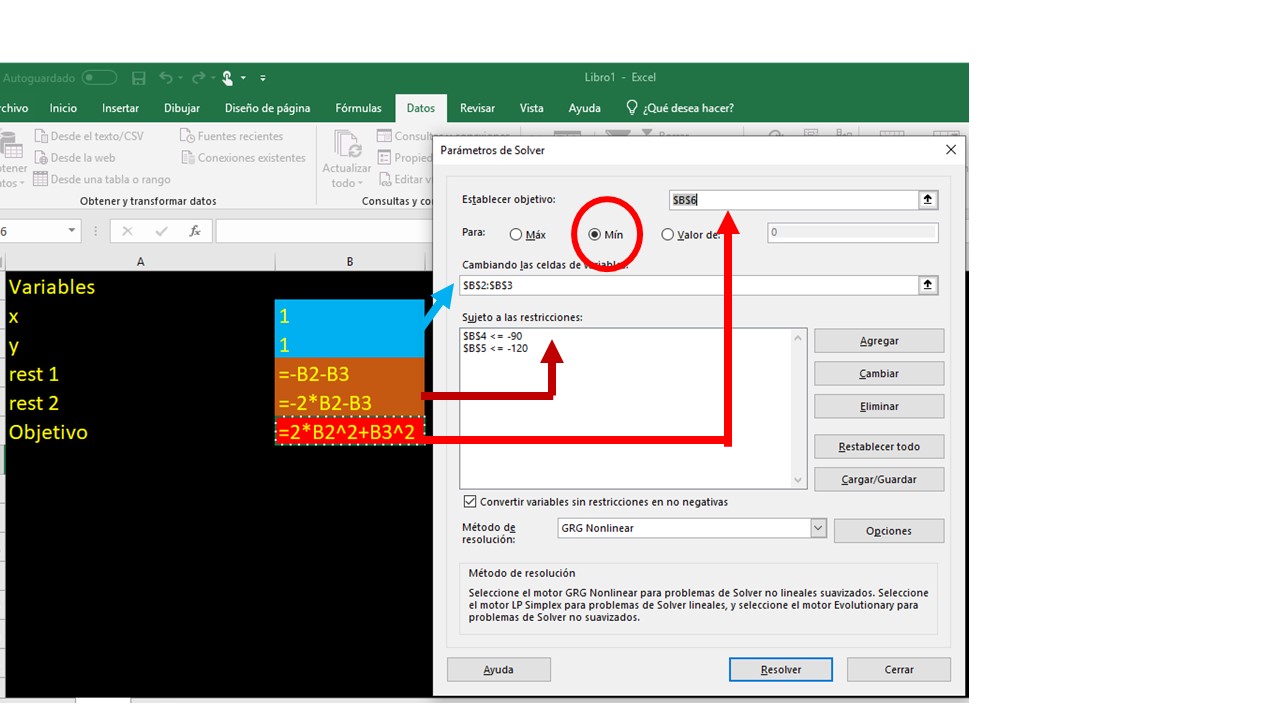Let’s see how, in a simple way, we can get the solution (from global otimo) using the solver tool in Excel. This tool you have to download it from file-options in the case that you have Windows and in tools in the case of that you have Apple.