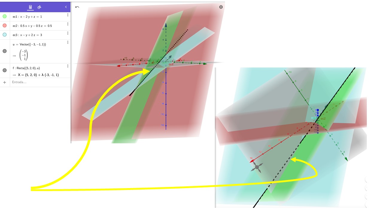 Otro ejemplo que puede visualizarse es un sistema de tres ecuaciones con tres incógnitas. Nota que, en realidad, tienes tres ecuaciones cartesianas de tres planos en \(\mathbb{R}^{3}\)