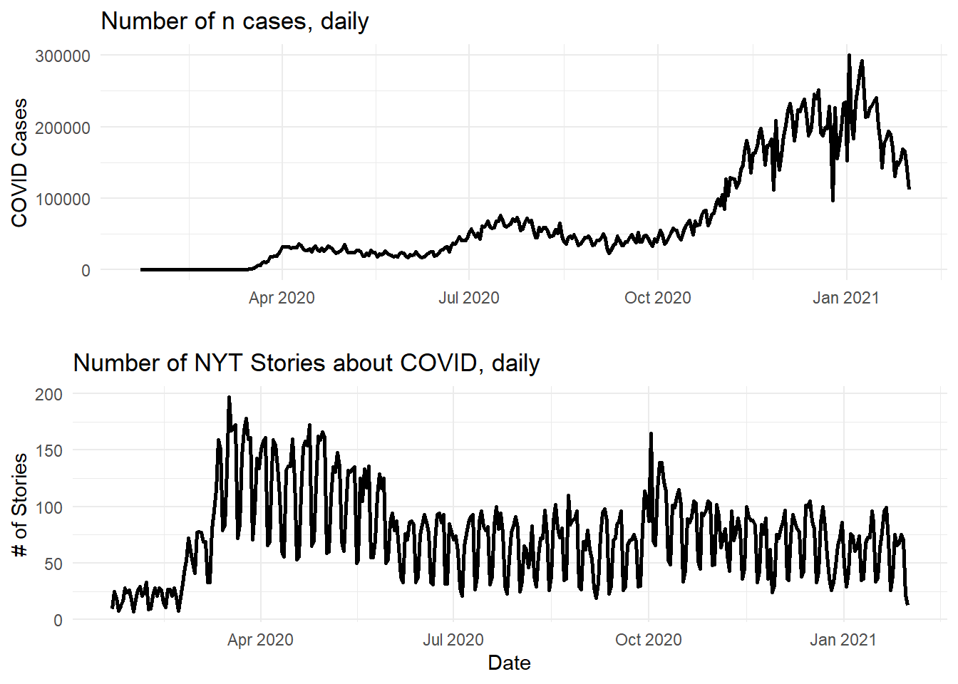 grid.arrange(plot_covid, plot_news, nrow = 2)## Warning: Removed 1 row(s) containing missing values (geom_path).