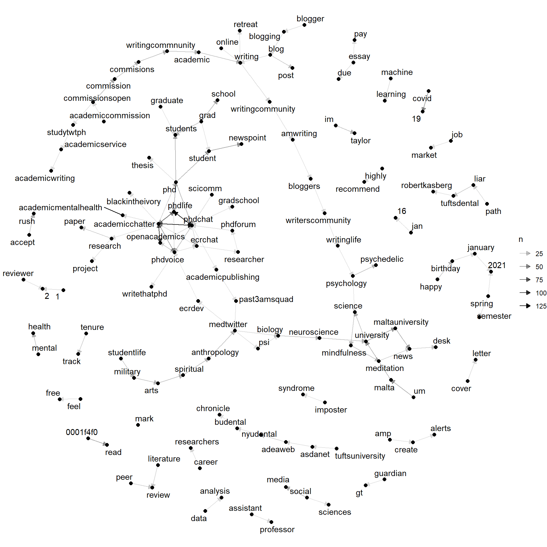 There’s a lot going on here, but we can see that hashtags (academicchatter, mentalhealth, phdchat) and common word-pairs (“reviewer 2” or “writing retreat”) appear in our analysis.