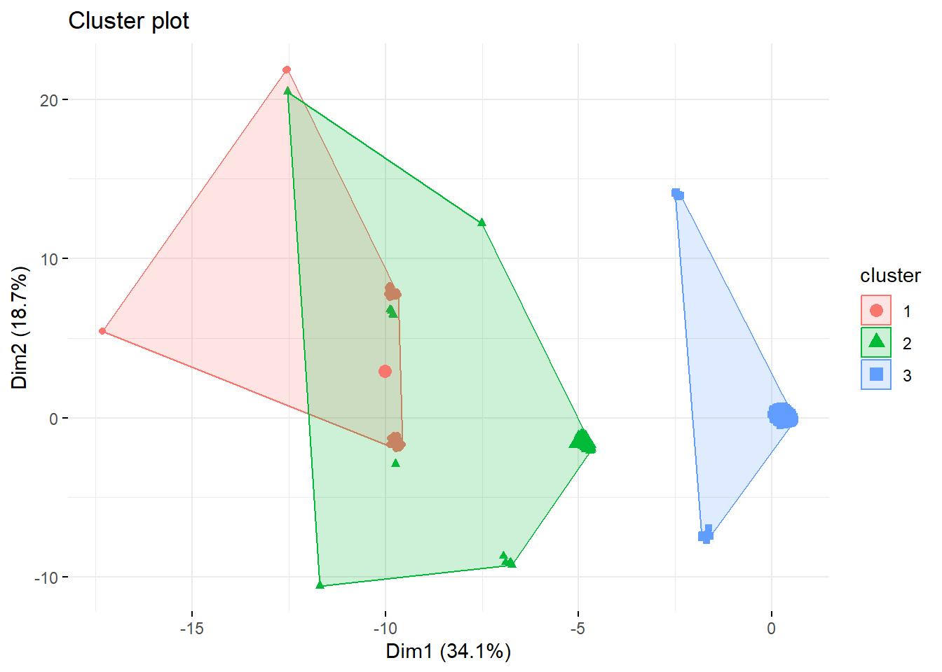 print(k3) #this will also print out the results per observation too## K-means clustering with 3 clusters of sizes 52, 250, 5872