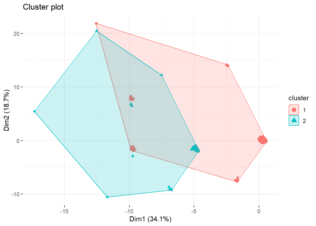 k2 <- kmeans(survey_data, centers = 2, nstart = 25)