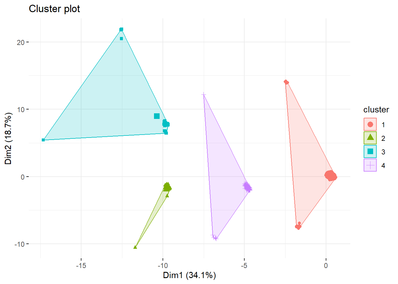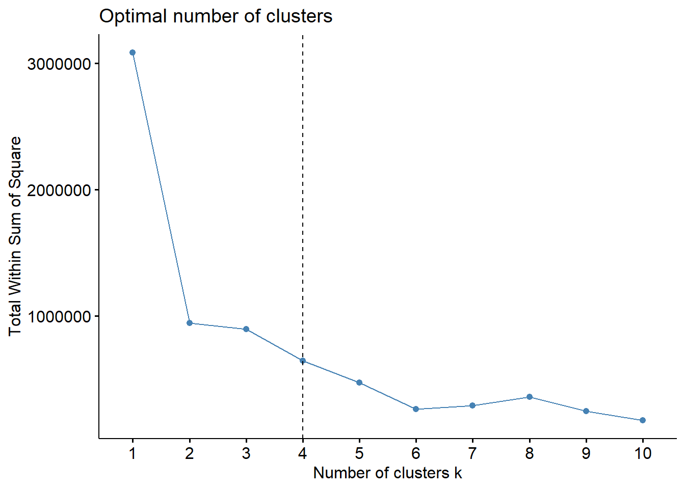 In this example, 4 appears to be the most optimal cluster, but there is also a marked drop in 2, which suggests that this may also be a useful number to cluster by.