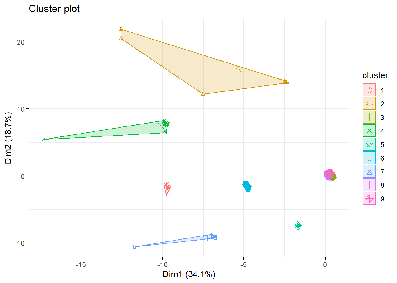 k9 <- kmeans(survey_data, centers = 9, nstart = 25)