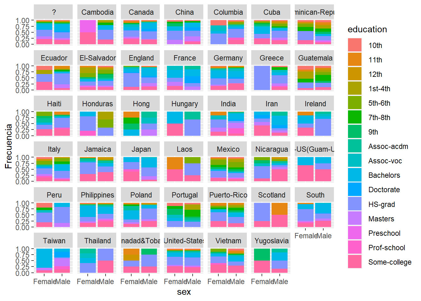 geom_bar(position="fill")+facet_wrap(~nativeCountry)+ylab("Frecuencia")