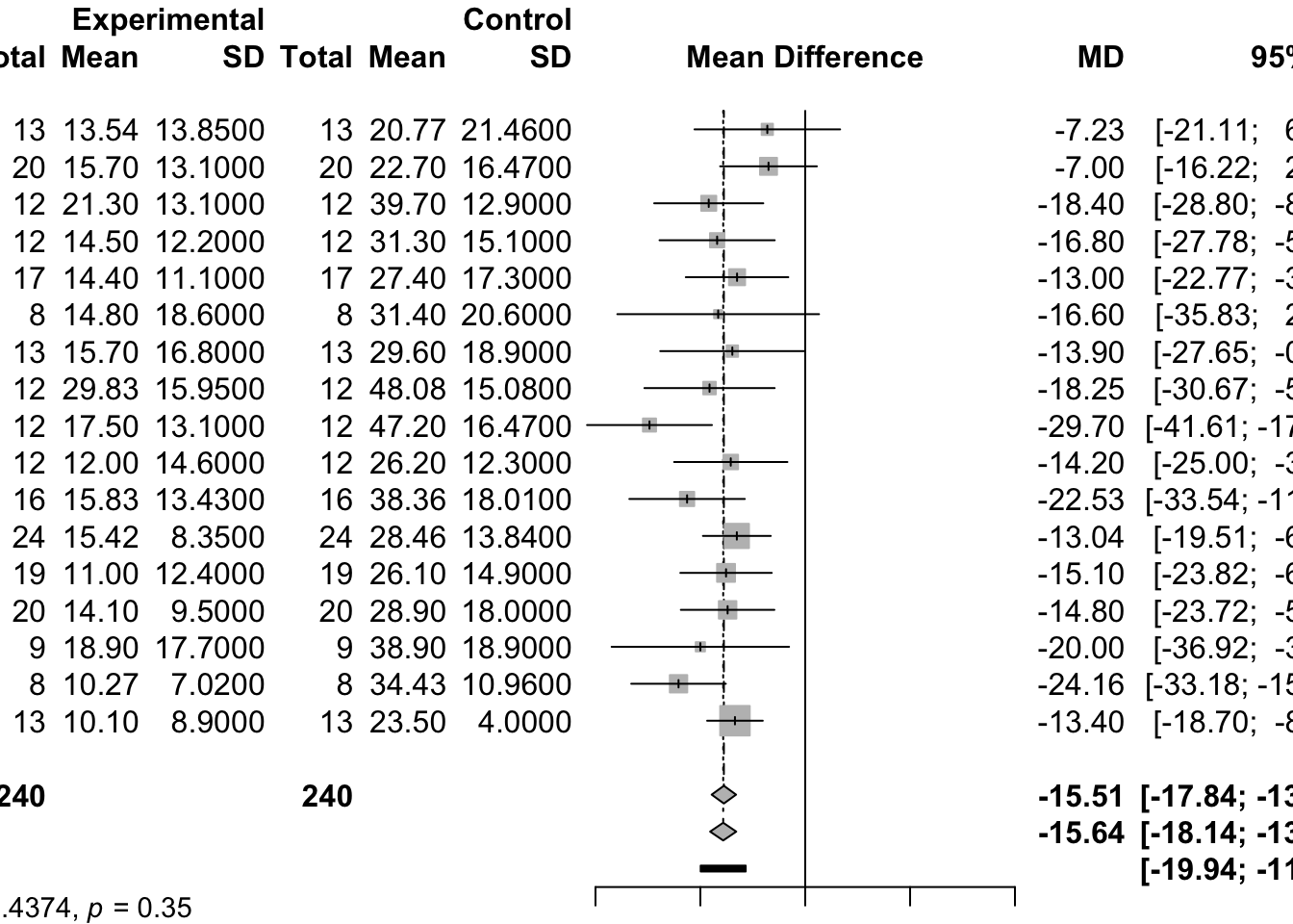 round(c(MD, MD + c(-1, 1) * qnorm(1 - (0.05 / 2)) * seMD), 2)[1] -7.23 -21.11 6.65