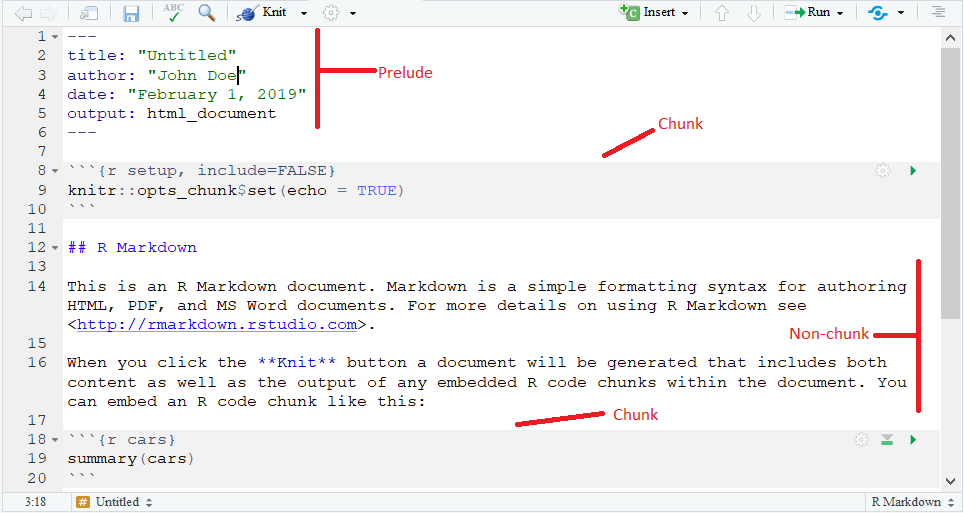 which looks similar to a script. Here is where you edit and create the content of your R Markdown. A R Markdown has three main components: the Prelude, the Chunk, and the Non-chunk, which are labeled in the above document for reference.