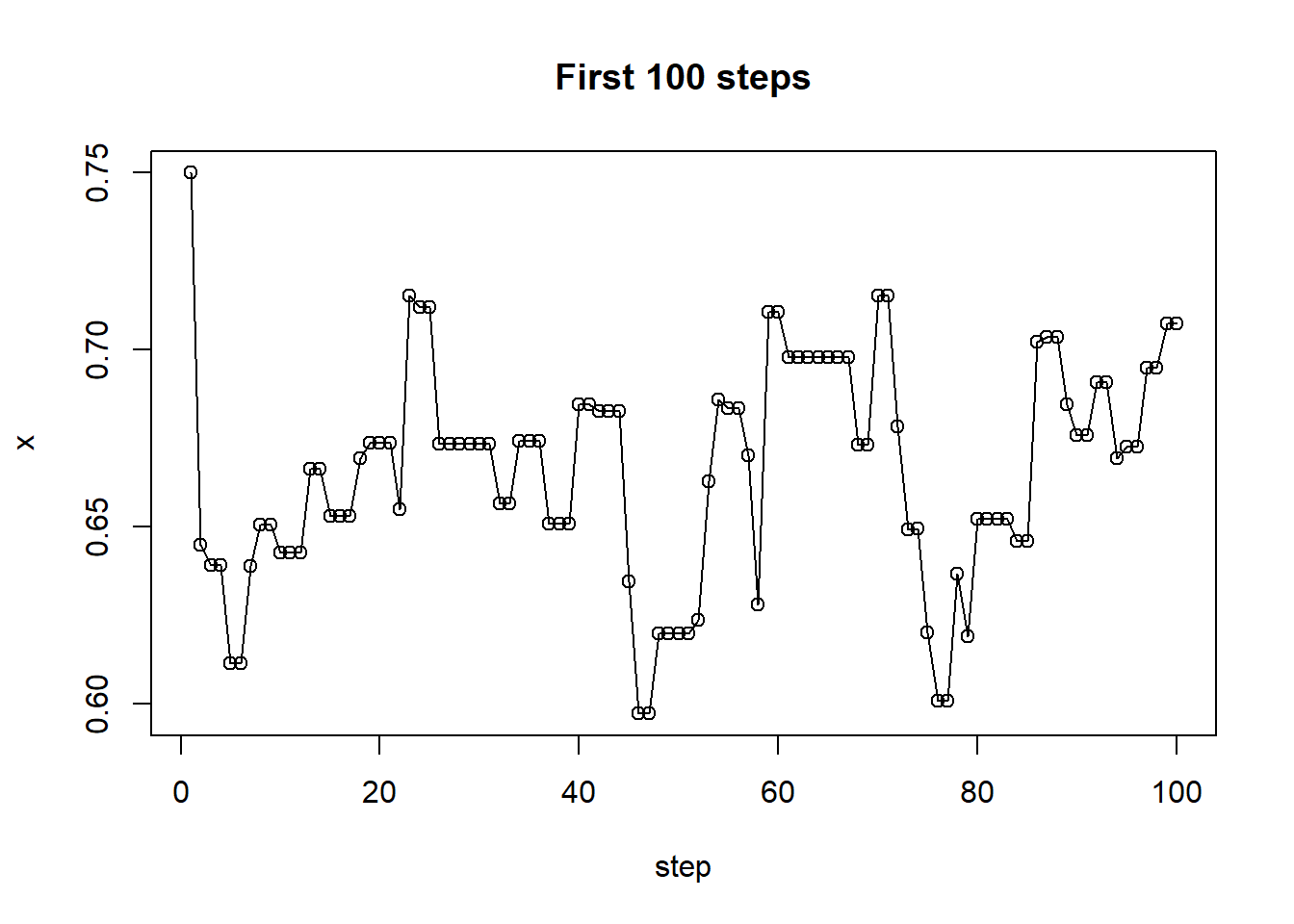 # trace plot of first 100 stepsplot(1:100, x[1:100], type ="o", xlab ="step",ylab ="x", main ="First 100 steps")