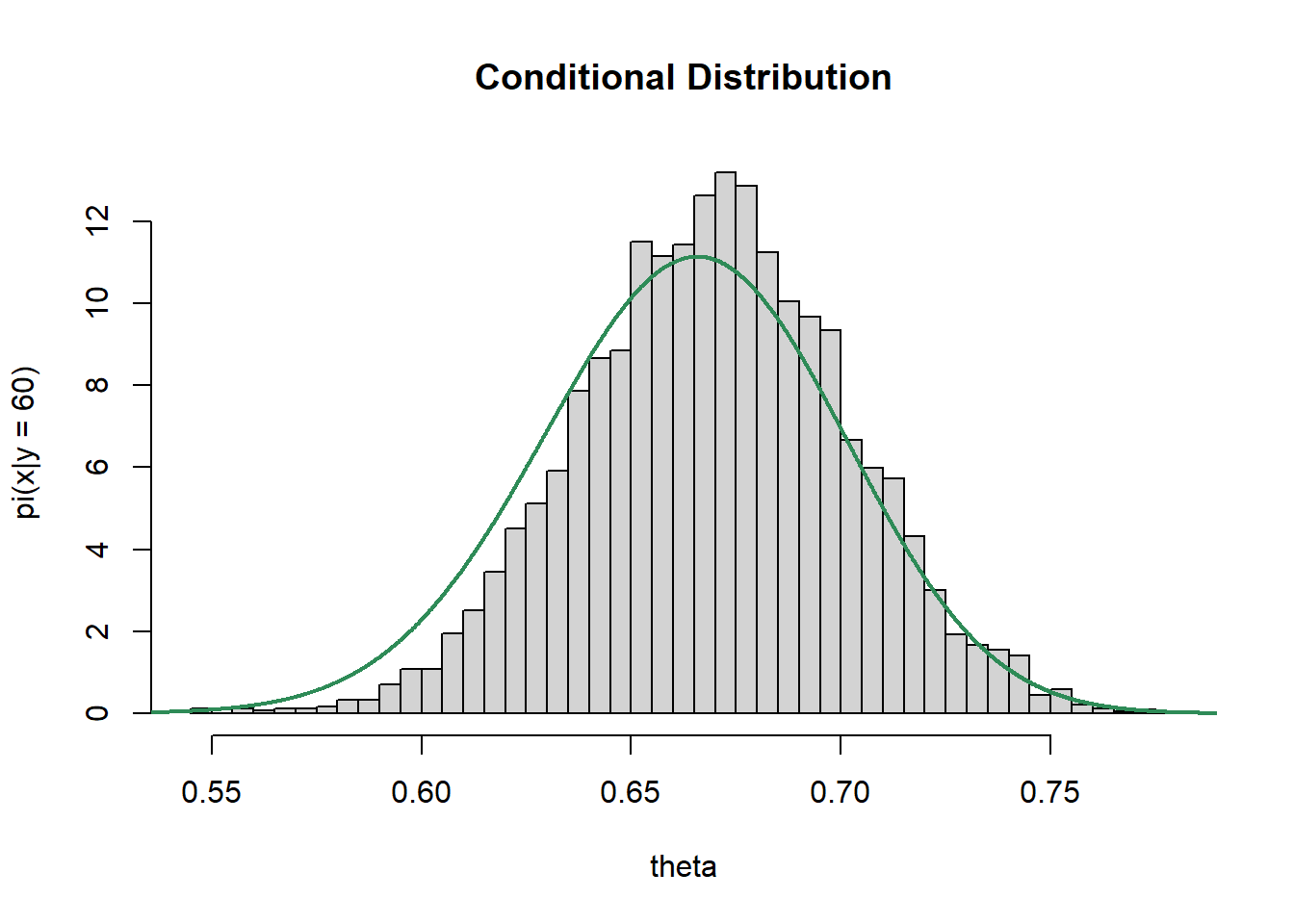 # simulated values of xhist(x, breaks =50, freq =FALSE,xlab ="theta", ylab ="pi(x|y = 60)", main ="Conditional Distribution")# plot of theoretical conditional density of x# Normal(0.75, 0.05) is approximately Beta(55.5, 18.5)# So conditional given Y = 60 is approximately Beta(55.5 + 60, 18.5 + 40)x_plot =seq(0, 1, 0.0001)lines(x_plot, dbeta(x_plot, 55.5+60, 18.5+40), col ="seagreen", lwd =2)