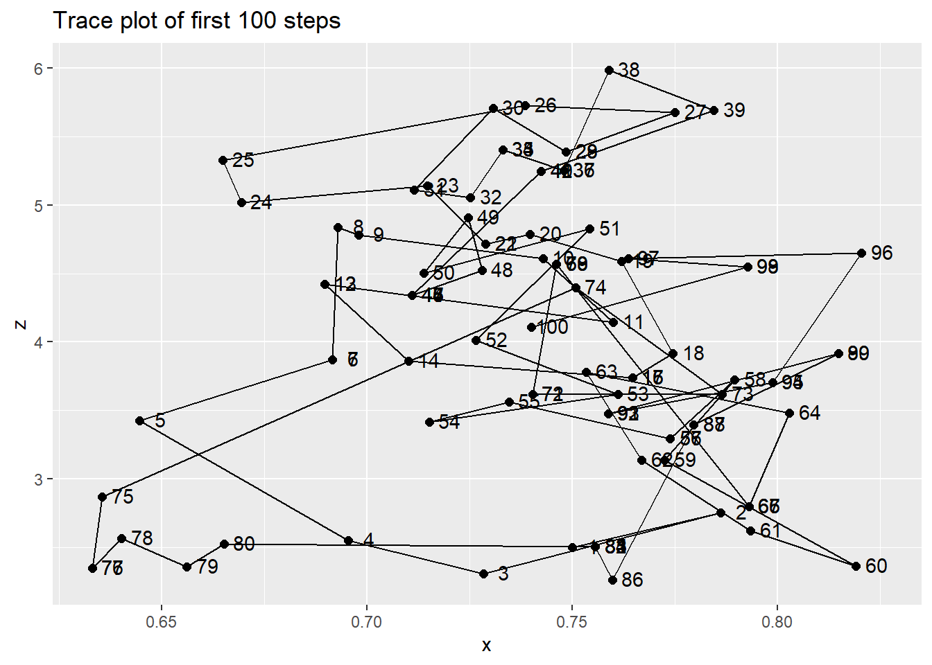# Trace plot of first 100 stepsggplot(xz[1:100, ] %>%mutate(label =1:100),aes(x, z)) +geom_path() +geom_point(size =2) +geom_text(aes(label = label, x = x +0.005, y = z +0.01)) +labs(title ="Trace plot of first 100 steps")