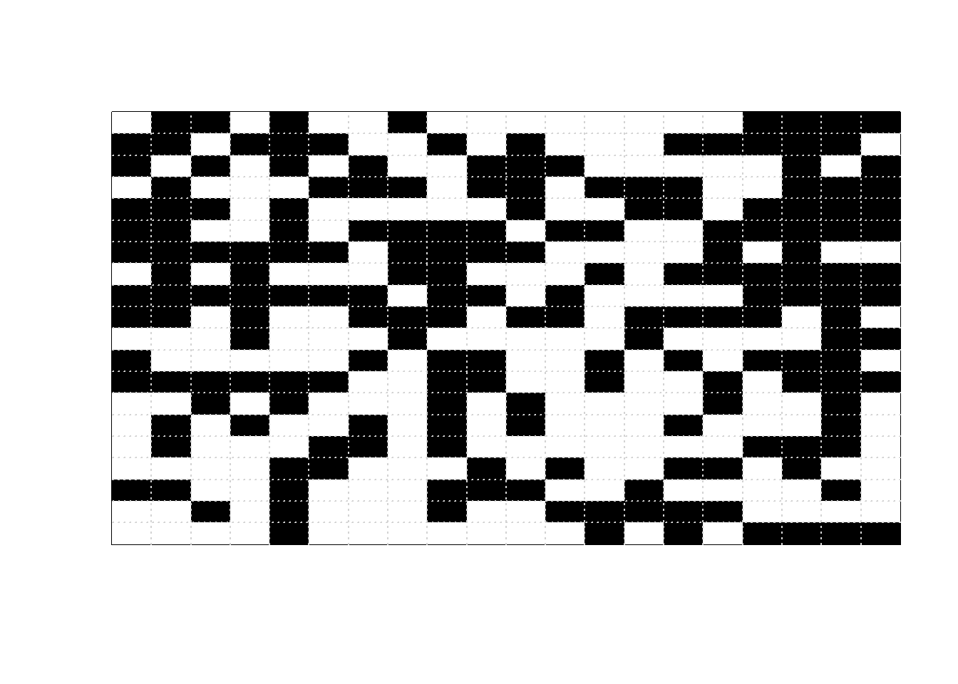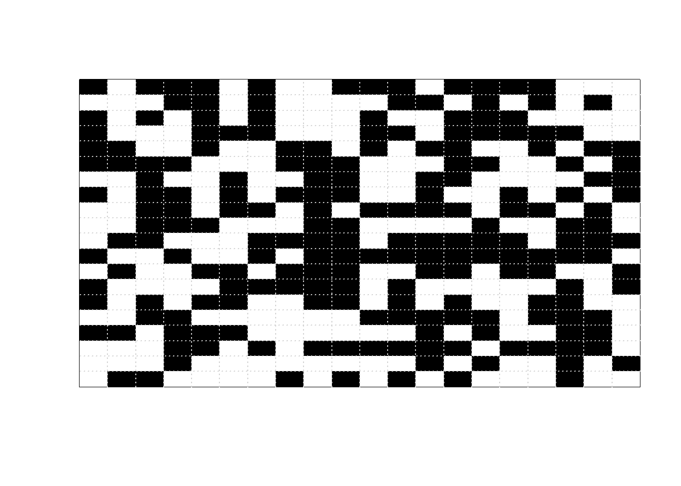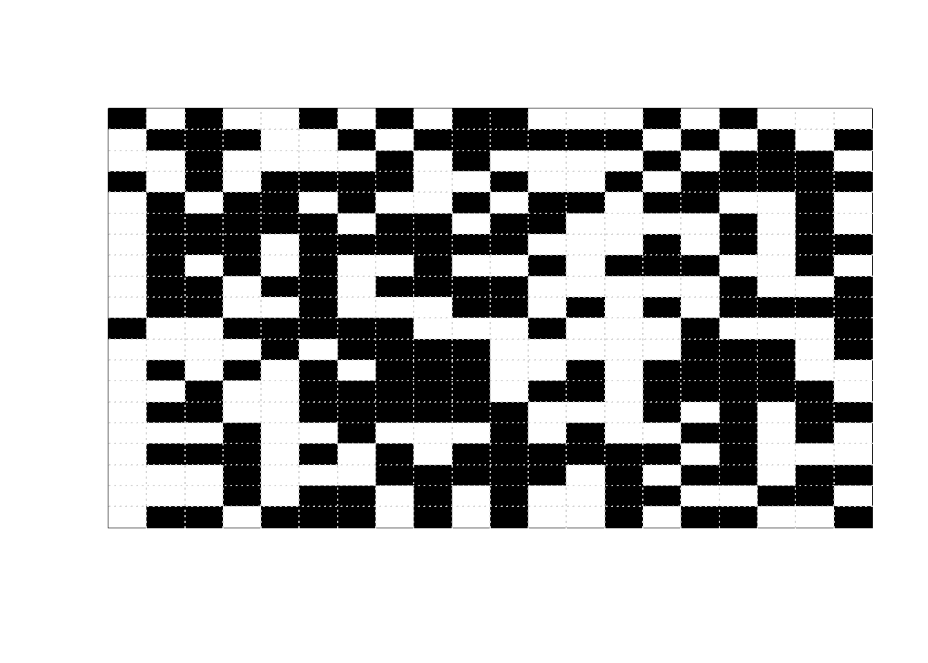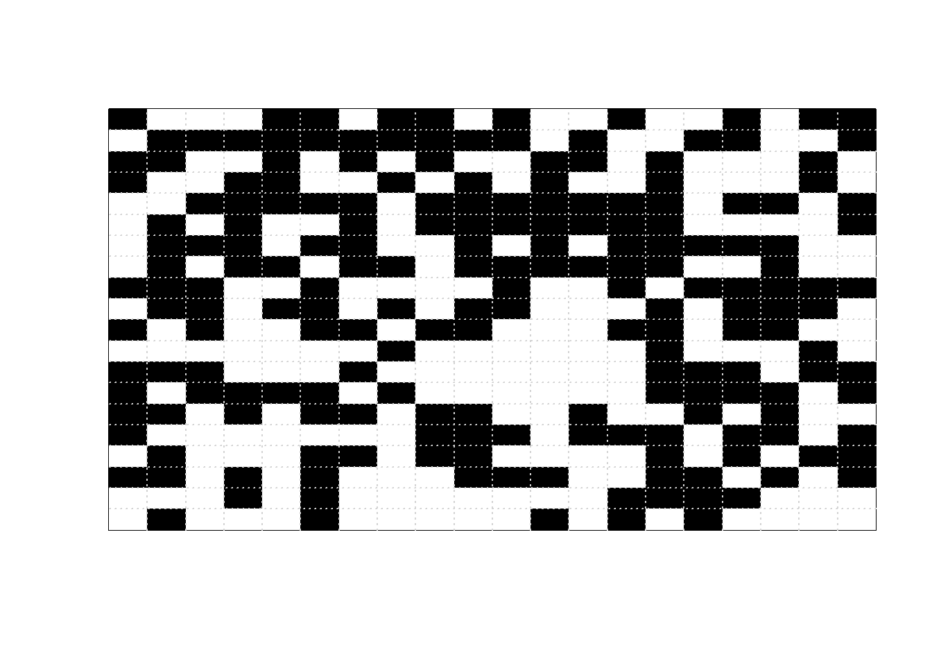 beta =5L =20Nsteps =10000print_iter =1000image_initial =matrix(sample(c(0, 1), L ^2, replace =TRUE),nrow = L)image_initial =matrix(rep(0, L ^2), nrow = L)image_current = image_initialfor (n in1:Nsteps) {# proposed pixel to flip x_proposed =sample(1:L, 1) y_proposed =sample(1:L, 1)# find neighbors of proposed pixel# interior pixels have four neighbors each# unique, max/min, and which below are just# to correct for corners and edges neighbor_proposed =unique(rbind(c(x_proposed, min(y_proposed +1, L)),c(x_proposed, max(y_proposed -1, 1)),c(min(x_proposed +1, L), y_proposed),c(max(x_proposed -1, 1), y_proposed) ) ) neighbor_proposed = neighbor_proposed[-which( (( neighbor_proposed[1, ] == x_proposed) & (neighbor_proposed[2, ] == y_proposed) )), ]# for current configuration, number of neighbors proposed state matches sum_current =sum(image_current[x_proposed, y_proposed] == image_current[neighbor_proposed])# for proposed configuration, number of neighbors proposed state matches sum_proposed =sum((1- image_current[x_proposed, y_proposed]) == image_current[neighbor_proposed]) accept_prob =min(1, exp(beta * (sum_proposed - sum_current))) color_current = image_current[x_proposed, y_proposed] image_current[x_proposed, y_proposed] =sample(c(1- color_current, color_current), 1,prob =c(accept_prob,1- accept_prob))if ( n %% print_iter ==0 ) {image(1:L, 1:L, t(image_current),xlab ="", ylab ="",zlim =c(0, 1), xaxt ="n", yaxt ="n",col =c("white", "black"))grid(L, L) }}