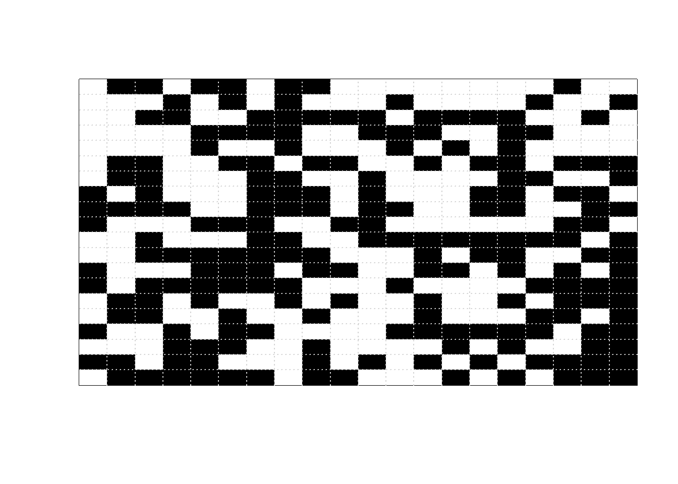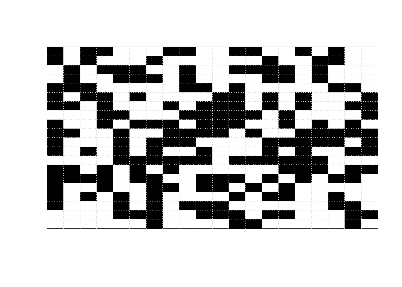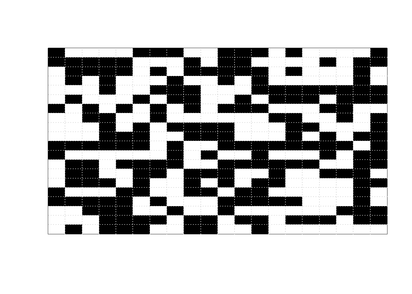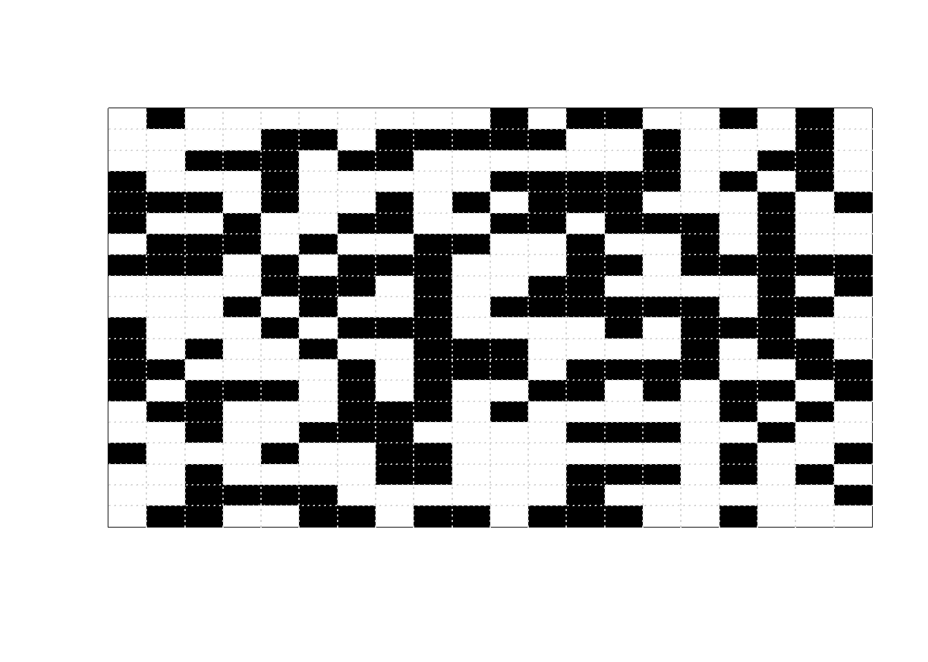 beta =5L =20Nsteps =10000print_iter =1000image_initial =matrix(sample(c(0, 1), L ^2, replace =TRUE),nrow = L)image_initial =matrix(rep(0, L ^2), nrow = L)image_current = image_initialfor (n in1:Nsteps) {# proposed pixel to flip x_proposed =sample(1:L, 1) y_proposed =sample(1:L, 1)# find neighbors of proposed pixel# interior pixels have four neighbors each# unique, max/min, and which below are just# to correct for corners and edges neighbor_proposed =unique(rbind(c(x_proposed, min(y_proposed +1, L)),c(x_proposed, max(y_proposed -1, 1)),c(min(x_proposed +1, L), y_proposed),c(max(x_proposed -1, 1), y_proposed) ) ) neighbor_proposed = neighbor_proposed[-which( (( neighbor_proposed[1, ] == x_proposed) & (neighbor_proposed[2, ] == y_proposed) )), ]# for current configuration, number of neighbors proposed state matches sum_current =sum(image_current[x_proposed, y_proposed] == image_current[neighbor_proposed])# for proposed configuration, number of neighbors proposed state matches sum_proposed =sum((1- image_current[x_proposed, y_proposed]) == image_current[neighbor_proposed]) accept_prob =min(1, exp(beta * (sum_proposed - sum_current))) color_current = image_current[x_proposed, y_proposed] image_current[x_proposed, y_proposed] =sample(c(1- color_current, color_current), 1,prob =c(accept_prob,1- accept_prob))if ( n %% print_iter ==0 ) {image(1:L, 1:L, t(image_current),xlab ="", ylab ="",zlim =c(0, 1), xaxt ="n", yaxt ="n",col =c("white", "black"))grid(L, L) }}