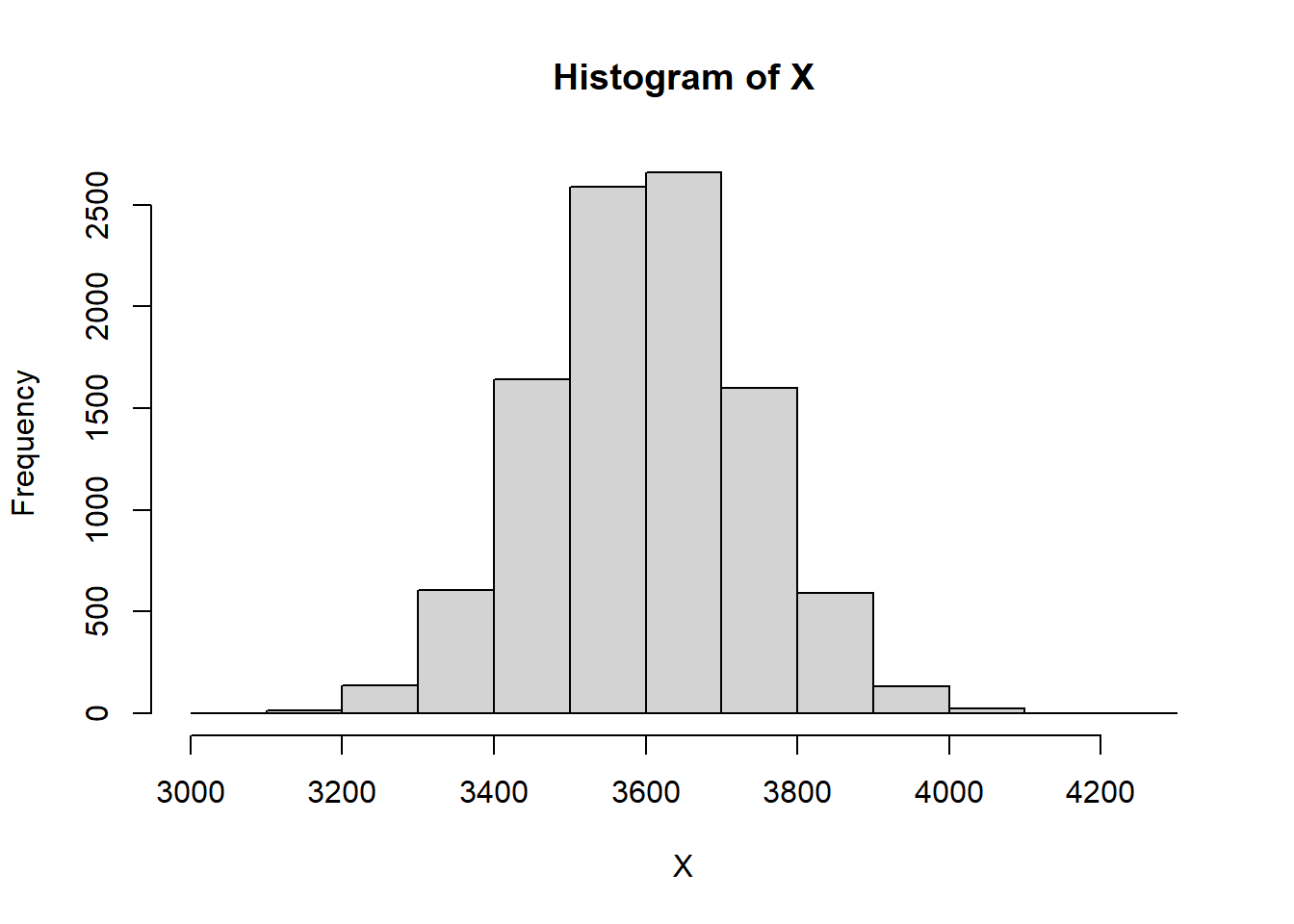 n_rep = 10000 t = 60 lambda = 12 mu = 5 sigma = 1.5 N = rep(NA, n_rep) X = rep(NA, n_rep) for (i in 1:n_rep) { N[i] = rpois(1, lambda * t) X[i] = sum(rnorm(N[i], mu, sigma)) } hist(X)