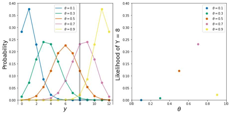 - \(f(y=8|\theta)=P(Y=8|\theta) = \binom{12}{8}\theta^8(1-\theta)^{12-8}\). This is a function of \(\theta\), with the data \(y=8\) fixed. Since this function computes the likelihood of observing the data (evidence) under different values of \(\theta\), “likelihood function” seems like an appropriate name. See the plots below.