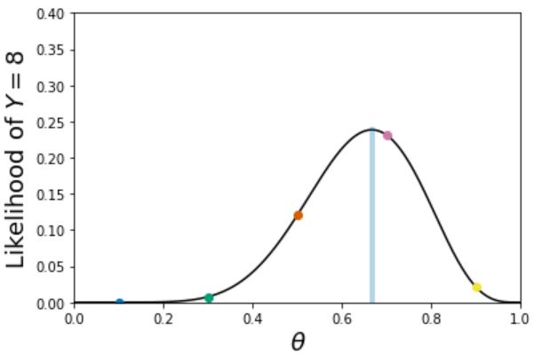 - For each value of \(\theta\) between 0 and 1 compute the probability of observing \(y=8\), \(P(Y = 8|\theta)\), and find which value of \(\theta\) maximizes this probability.