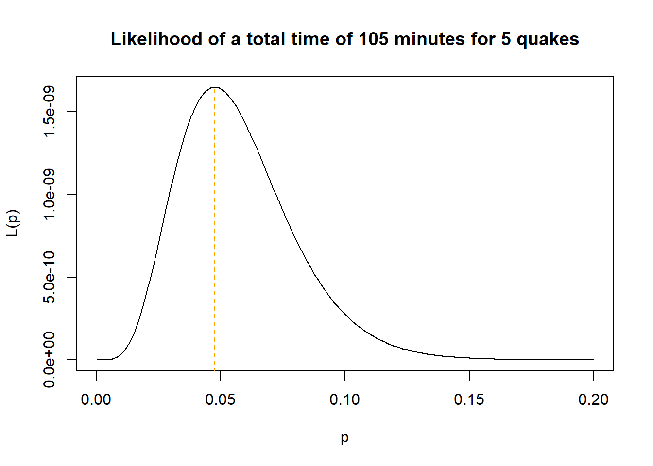 x =c(20, 37, 13, 10, 25)xbar =mean(x)lambda =seq(0, 0.2, 0.001)plot(lambda, lambda ^5*exp(-lambda *sum(x)), type ="l",xlab ="p",ylab ="L(p)",main ="Likelihood of a total time of 105 minutes for 5 quakes")segments(x0 =1/ xbar, x1 =1/ xbar, y0 =-1, y1 = (1/ xbar) ^5*exp(-(1/ xbar) *sum(x)), col ="orange", lty =2)