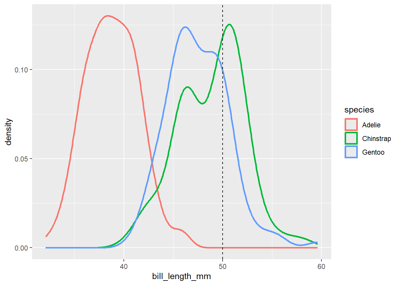 Among these three species, the likelihood of having of a 50mm bill is greatest for Chinstrap. Does that mean we should necessarily classify the penguin to be Chinstrap? Why?