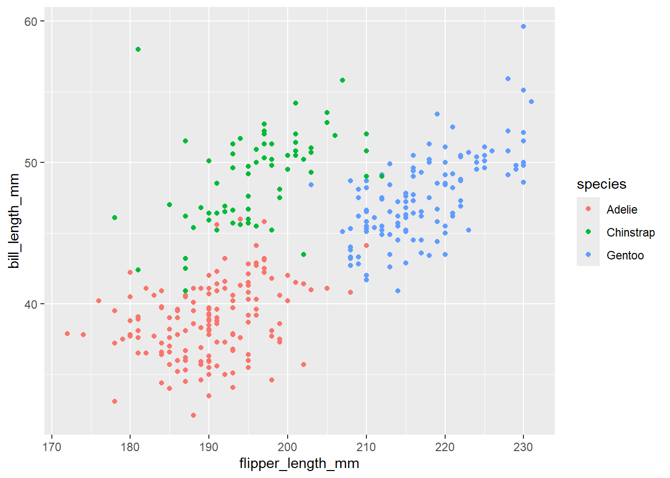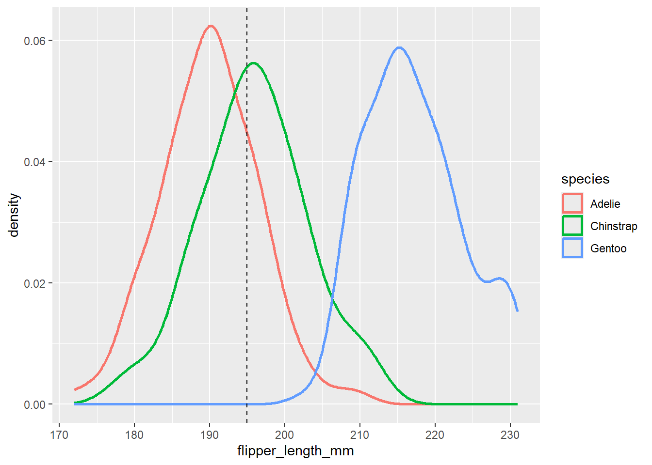 Example 26.4 Now suppose we know that a penguin has a bill length of 50mm and a flipper length of 195mm. (We’ll ignore whether or not it is below average weight for this example.)