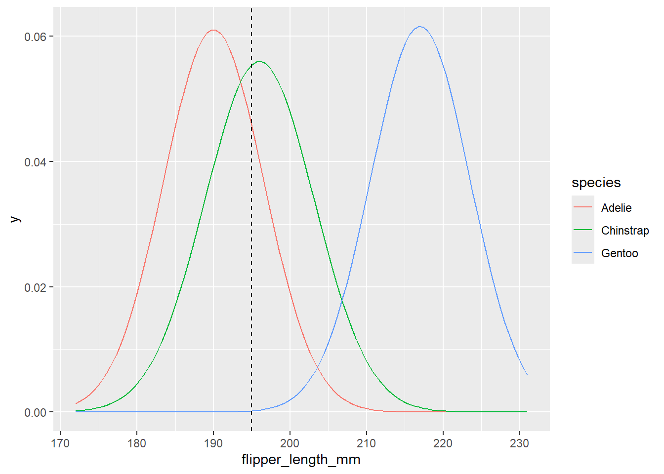 Suppose that flipper lengths (mm) follow a N(190, 6.54) distribution for Adelie, a N(196, 7.13) distribution for Chinstrap, and a N(217, 6.48) distribution for Gentoo. (Recall that bill lengths (mm) follow a N(38.8, 2.66) distribution for Adelie, a N(48.8, 3.34) distribution for Chinstrap, and a N(47.5, 3.08) distribution for Gentoo.) How would you fill in the likelihood column? What are we assuming?