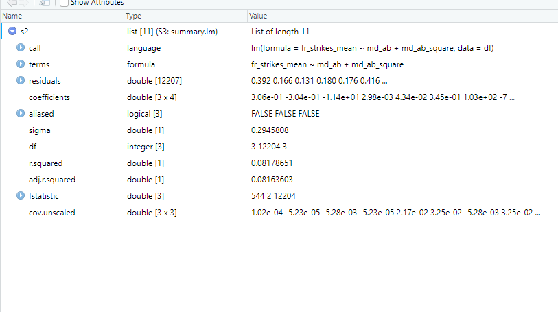 s2 <- summary(m2)Both of these objects are structured as lists of lists. The whole object itself is a list, and each of the relevant outputs - e.g the coefficients - are a list within that list. We can eyeball what is in there by saving our summary object as an object, and clicking on the object name in our environment. This brings up the following.