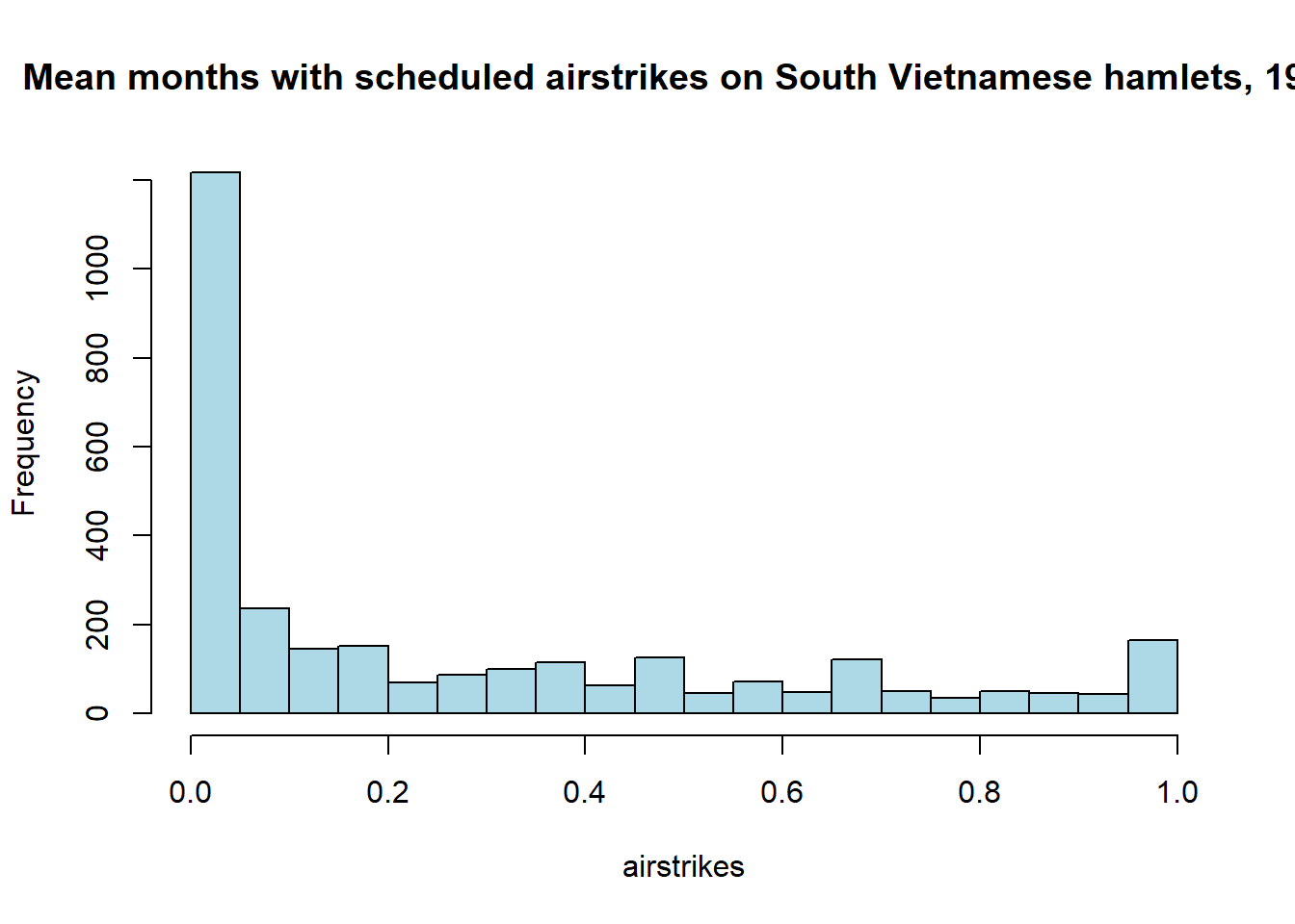 For illustration, we use a real life dataset from (Dell and Querubin (2018) ‘Nation Building Through Foreign Intervention: Evidence from Discontinuities in Military Strategies’)[https://dell-research-harvard.github.io/projects/492bombing]. This paper measures the effect of increased US firepower on support for insurgents in South Vietnam during the Vietnam war. In this section, we simply manipulate the data. In the section on modeling, we look at some relationships in this data.