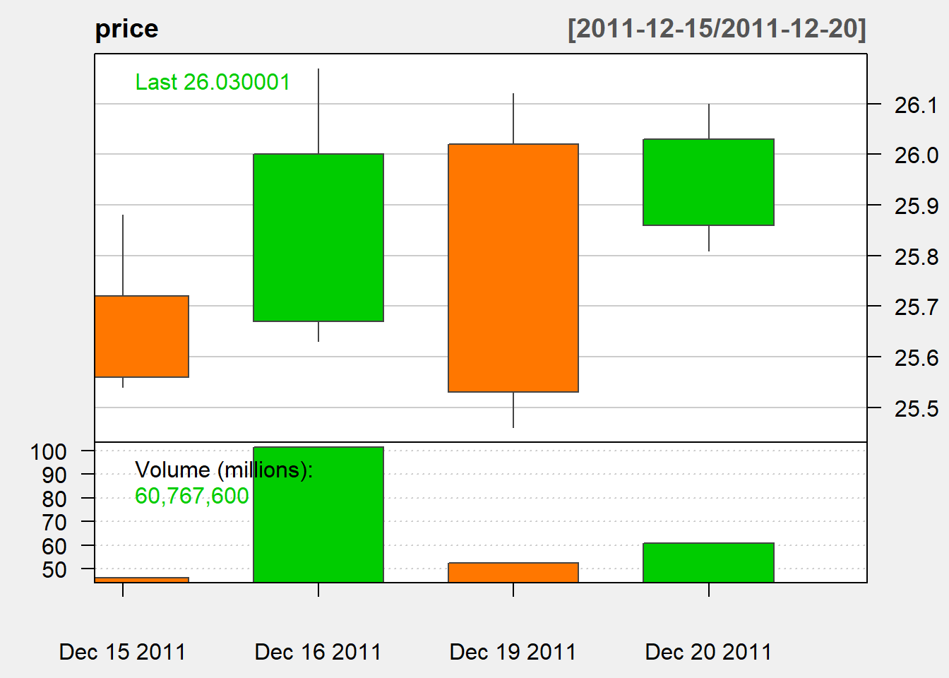 price <- MSFT['2011-12-15/2011-12-20'] candleChart(price, theme='white')