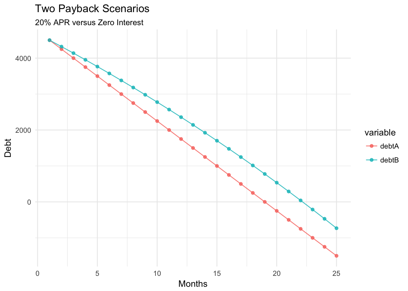 labs(title = "Two Payback Scenarios", subtitle = "20% APR versus Zero Interest", x = "Months", y = "Debt")