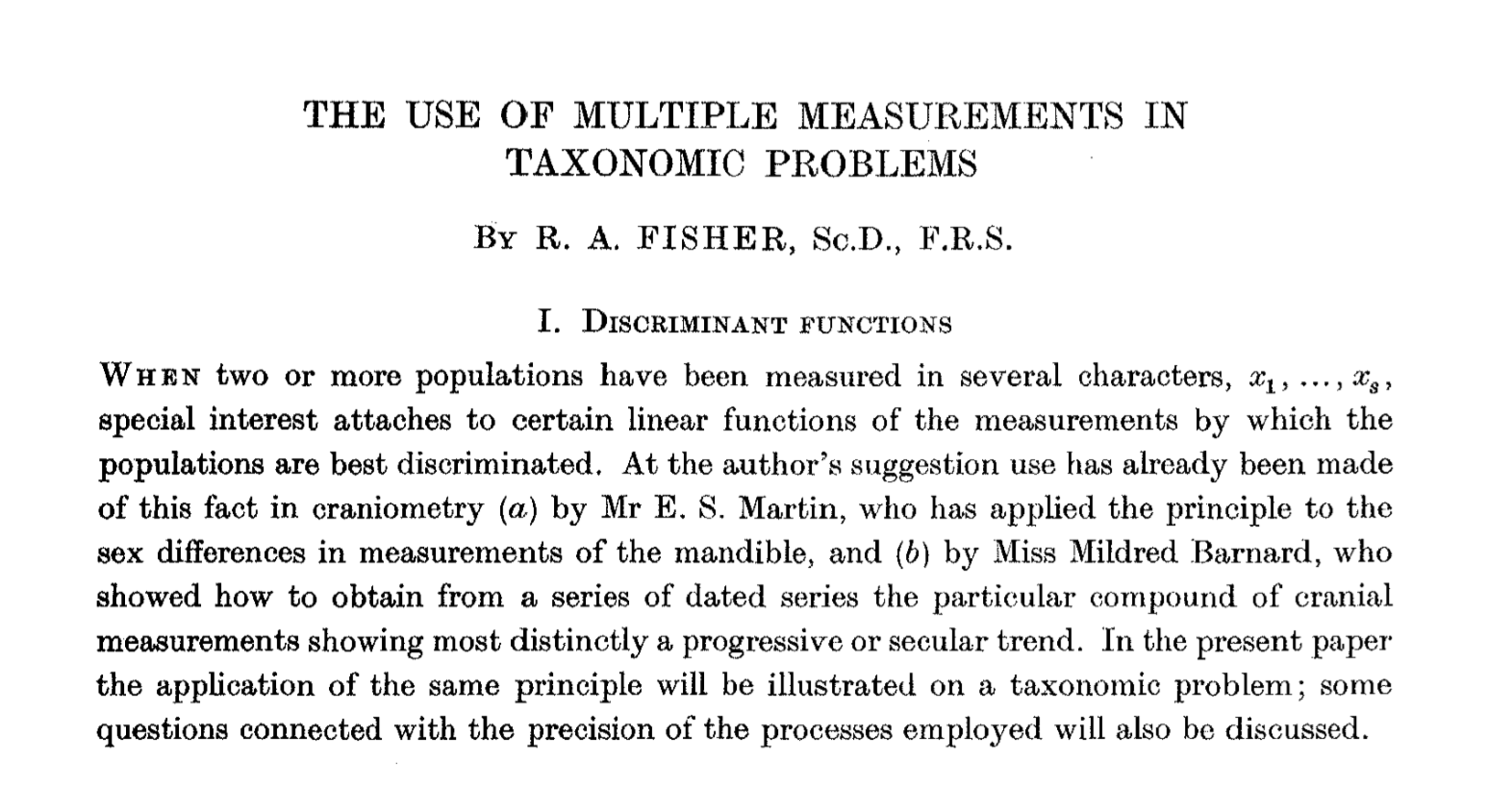 We will use a single example dealing with three species of the iris flower. This data comes from a famous experiment on a series of measurements of three species of iris flowers. R A Fisher, a statistically minded thinker in the early twentieth centure used this dataset in his 1936 paper The Use of multiple measurements in taxonomic problems, published in the Annals of Eugenics. We will begin by using this data to investigate some basic questions one might have about the data. These questions will not be limited to this dataset however, and we must note that there is some kind of relationship to Eugenics in the taxonomic problem for Fisher.