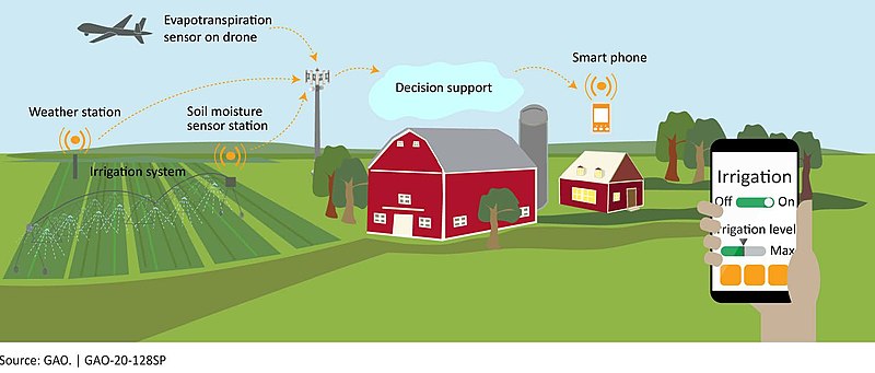 Agriculture often involves making complex decisions around when and where to plant crops, what types of crops to plan, and timing and amount of irrigation, pesticides, herbicides, and fertilizers. Farmers must often balance the crop yield with the economic considerations of the costs, subsidies, market, and profit margins of their crops. Forests also can be actively managed for many purposes including timber harvests, aesthetics, and recreation. Precision agriculture and forestry involve managing crops and forests using data and predictions that are specialized for within an agricultural field or forest stand. This type of approach develops specialized management plans and solutions that will be more cost efficient, lead to higher yield/productivity, and can have a better environmental impact. For example, irrigating crops only when additional water is necessary can reduce water consumption or applying smaller, more targeted amounts of fertilizer can reduce runoff pollution and decrease costs. In forestry, regrowth and harvesting can be targeted to species and locations with optimal conditions. Precision approaches to forestry and agriculture use high spatial resolution data over small scales (field/forest) using sensors and remote sensing. The diagram below illustrates the data streams that can go into precision management of irrigation amounts.
