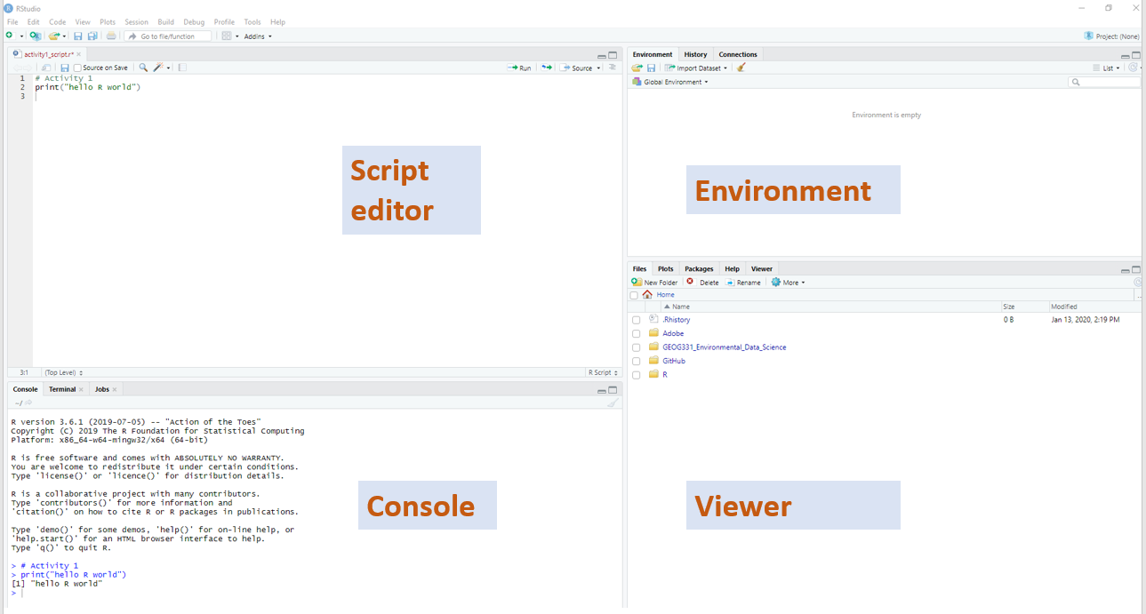 The Rstudio interface has 4 main components: 1. script window, 2. console, 3. environment, 4. viewer & information tabs. In the next section, you will learn more about each of these parts of the interface.