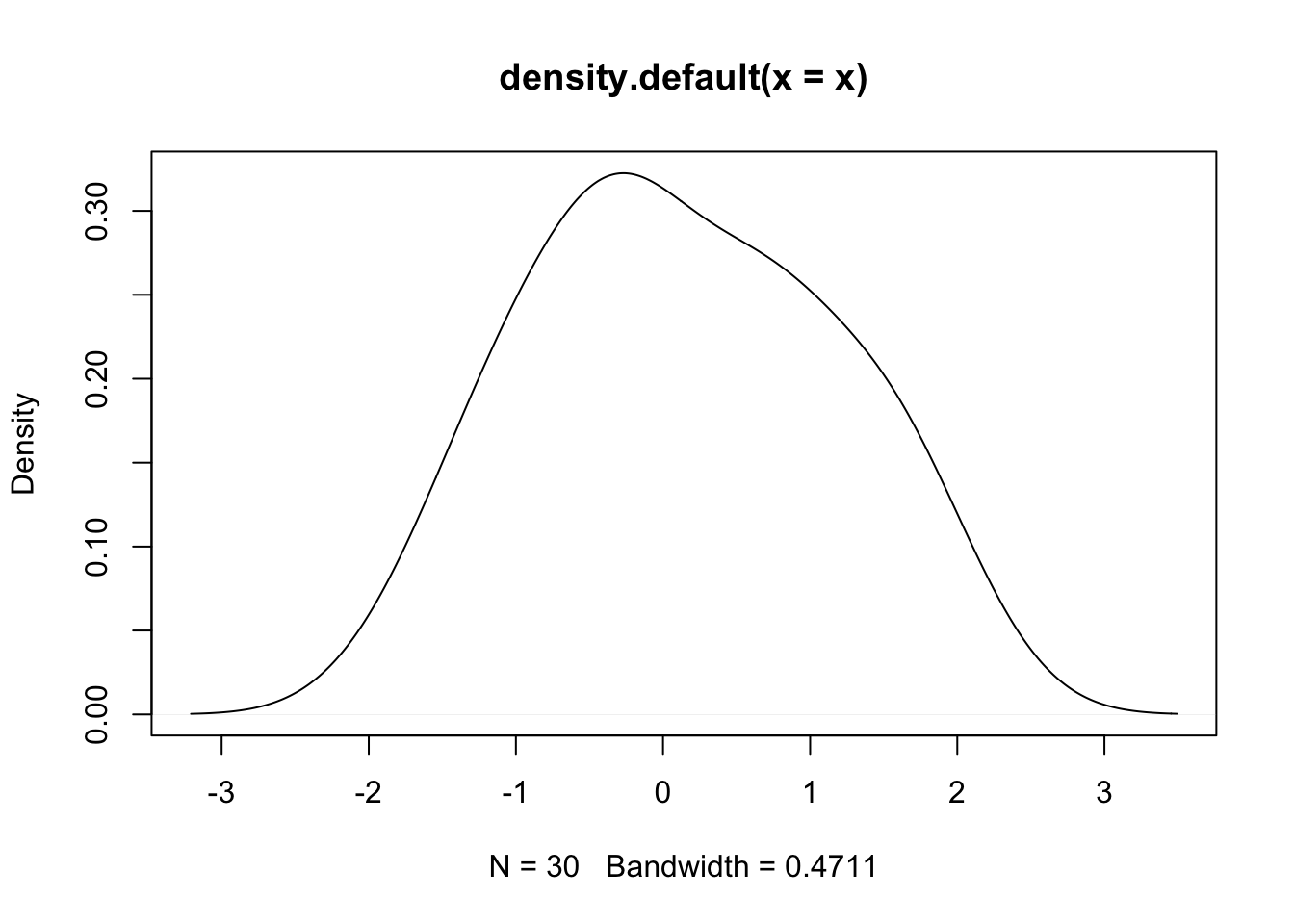 - Example (cont.): Say we have some number of independent observations, X, from a standard normal distribution, so the truth is that \(\mu=0\). Here is a density plot from a draw of 30: