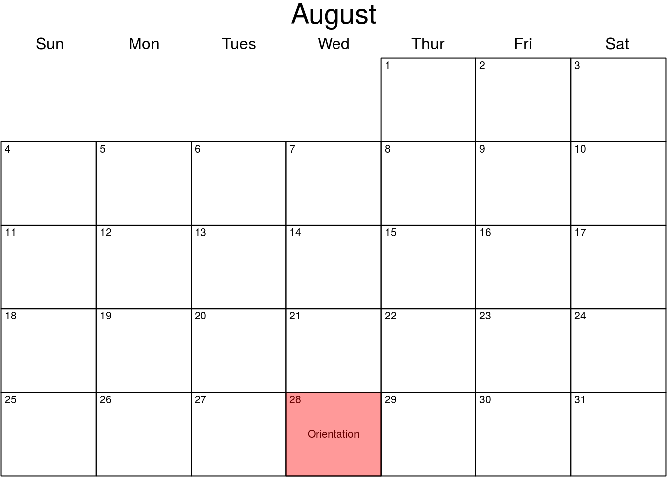 Orientation 8/28/2019 6:00-??PM Opportunity for incoming students to become more acquainted with each other, the second years (Eagle IO), and professors. On Campus: Dickson Hall Room Off-campus: Alexa’s https://www.alexussteakhouse.com/ NA