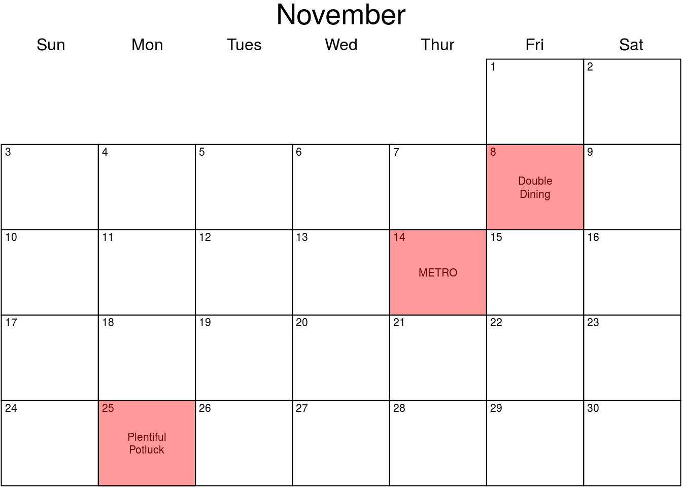 Plentiful Potluck 11/25/2019 12:00-2:00PM Every member of the program can bring some food to mingle with each other. People can filter in and out while enjoying some great snacks. On-Campus: Dickson Hall Room 259 NA