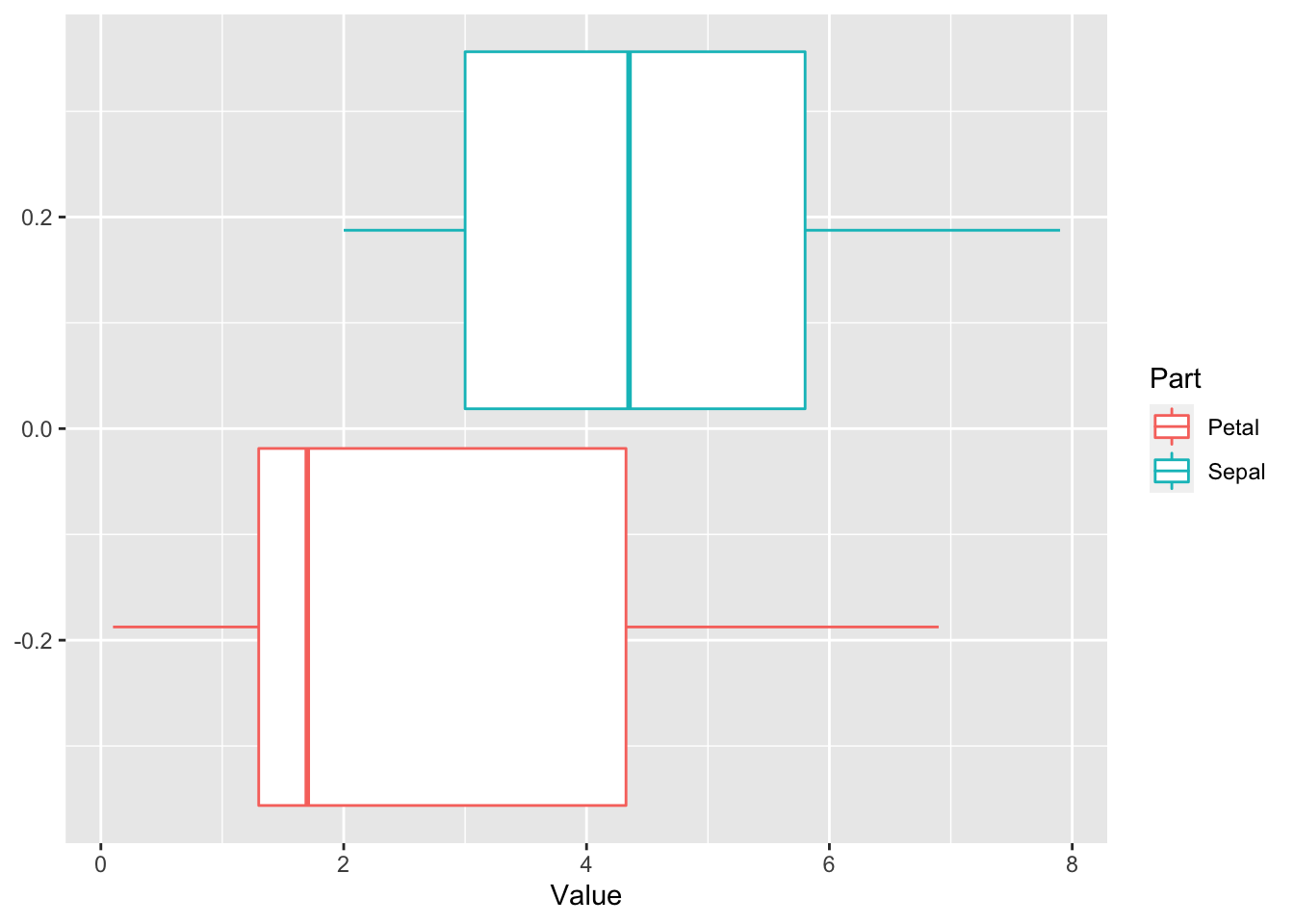 ggplot(aes(x = Value, color = Part)) + geom_boxplot()
