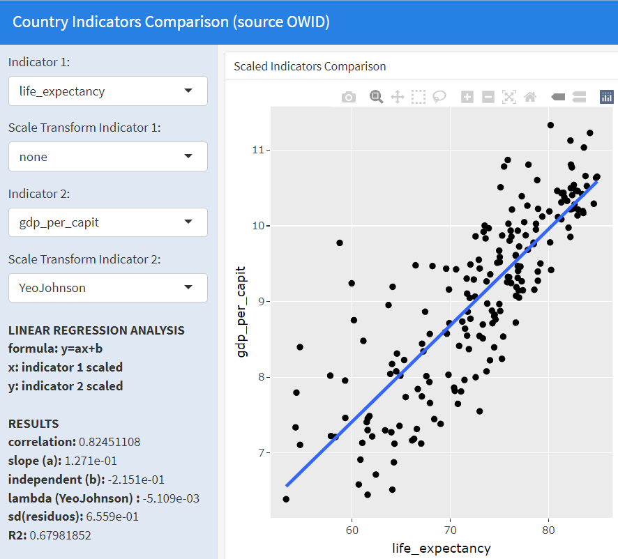 Sin embargo, al activar la opción “YeoJohnson” en el cuadro de mandos, se aplica la transformada Yeo-Johnson a la segunda variable y, como podemos observar en la siguiente imagen, obtenemos un ajuste lineal mucho mejor con un valor de \(\lambda=5.1e-3\). Ello nos indica que existe una relación no-lineal entre ambas variables que ha sido capturada usando la transformación de Yeo-Johnson.