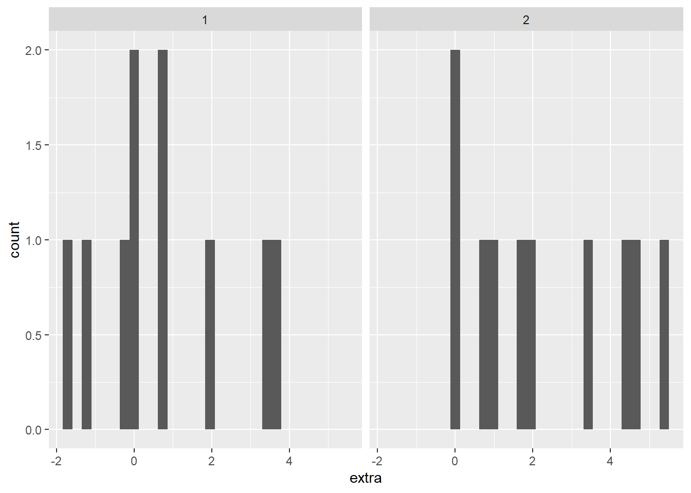 Since we have met our assumptions, we can run the independent samples t-test, as shown below. We use the t.test() function again, with some extra arguments. This time, we first pass it the formula we want it to use (extra ~ group): comparing extra by group. Then we specify what data to use (data = df), and that we have equal variances (var.equal = TRUE). If we did not have equal variances we could pass var.equal = FALSE to the function.