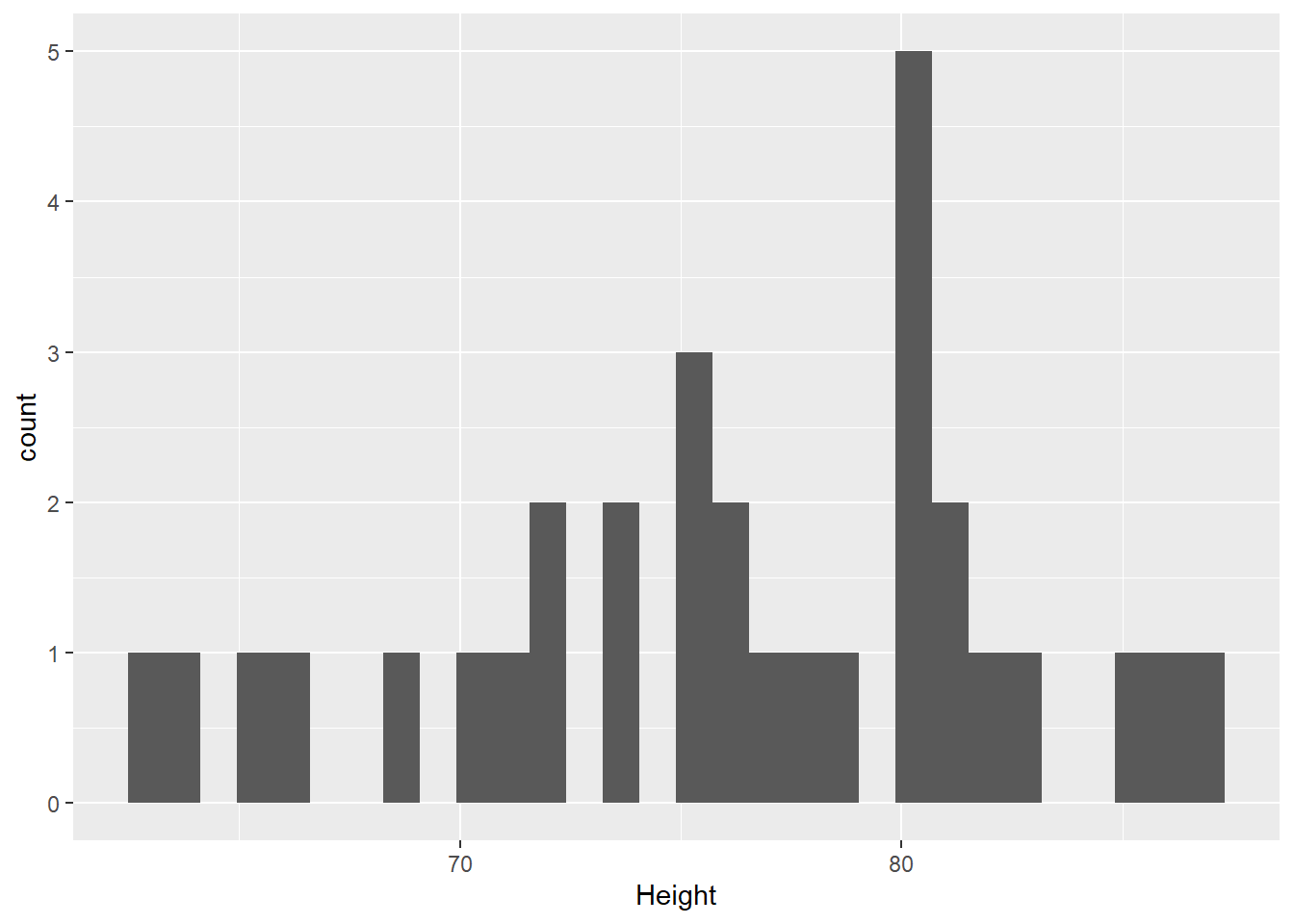 We can see how our data is distributed by using a histogram. ggplot2 is a package with a wide range of graphing capabilities that we will be using for our graphs. There is a later chapter (PUT CHAP REF HERE) specifically on ggplot that explains in more detail what goes with each argument. For this histogram, we are specifying what data to use (trees), and what variable we want to look at (Height). We then say that we would like a histogram (geom_histogram).